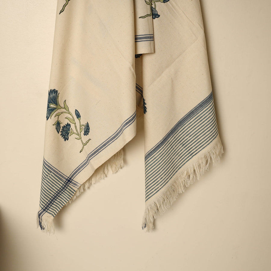 Hand block printed handloom cotton sanganeri towel, crafted using traditional hand block-printing techniques by Purushottam Chhipa. Woven in Jhiri, Rajasthan, with natural VAT dyes that ensure vibrant, bleed-free designs. Perfect for those who value sustainable and handmade craftsmanship. Discover the beauty of authentic prints and support local artisans through each purchase.