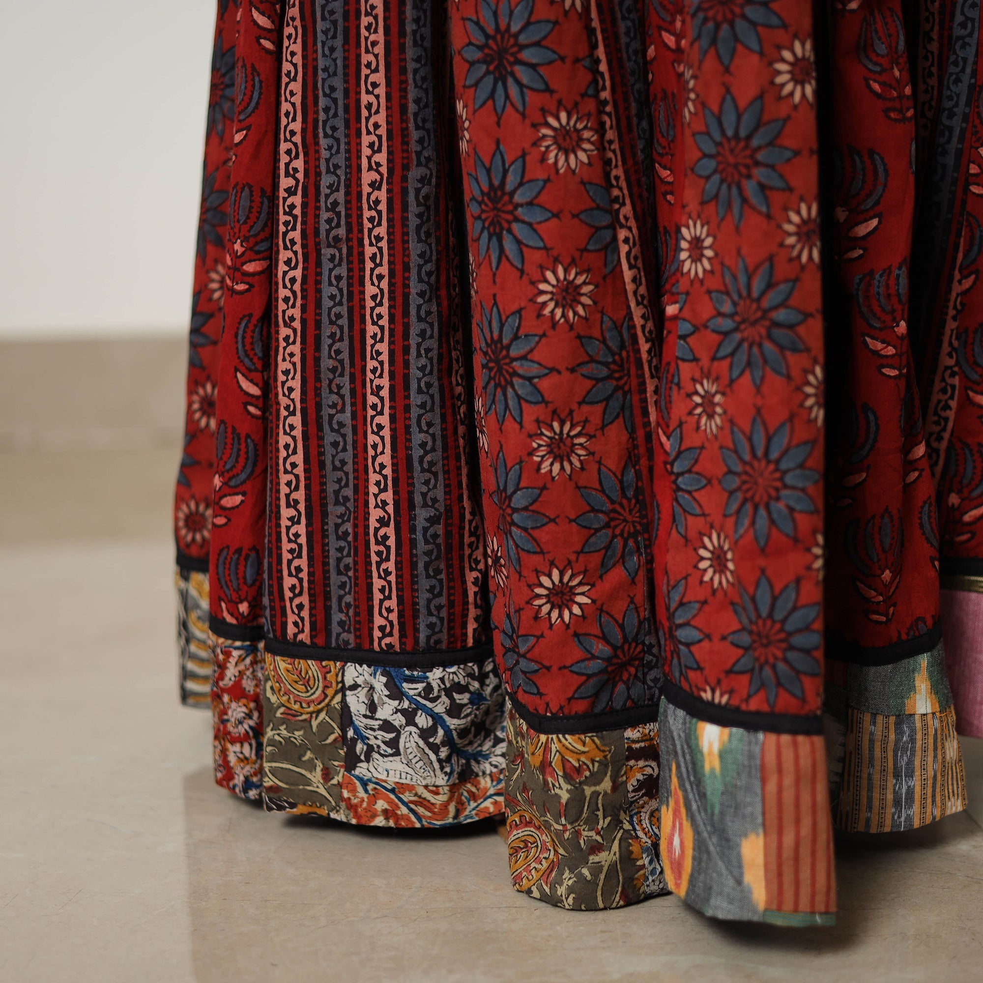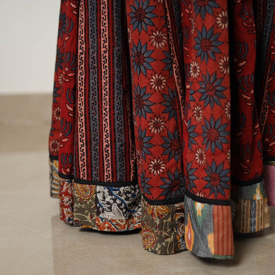 Red hand block printed ajrakh long skirt. The patchwork kali design adds a unique touch, showcasing the skilled craftsmanship. Graceful flared appearance, making it perfect for office wear, casual outings, or lunch parties.