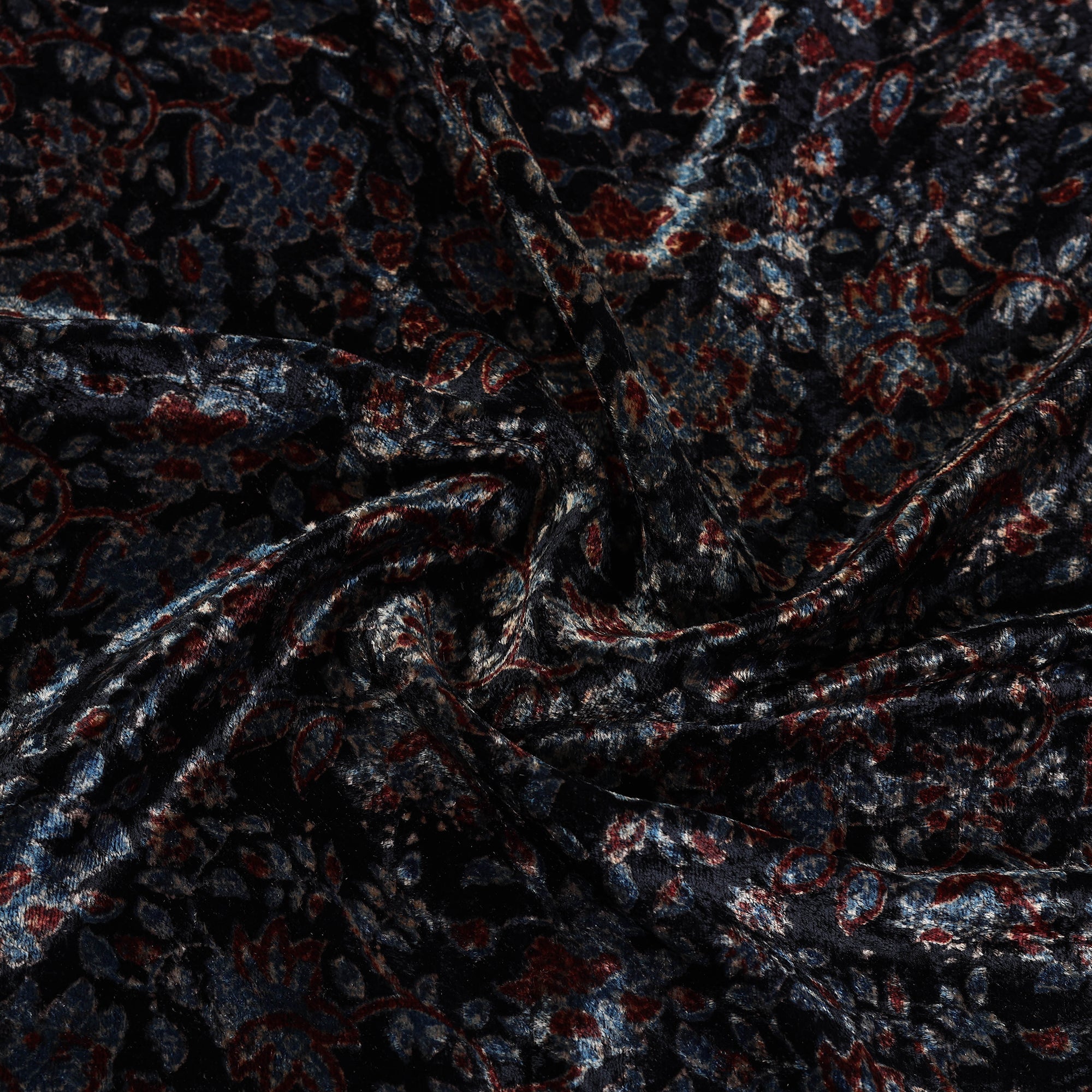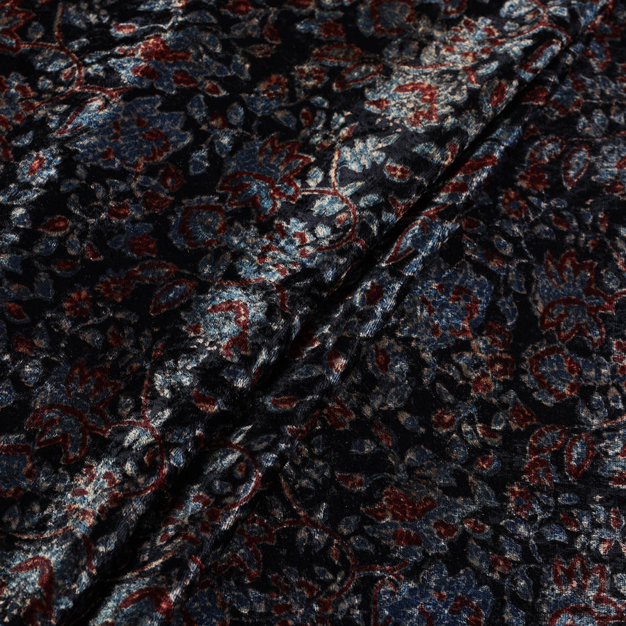 Handcrafted beauty of black block printed velvet natural dyed ajrakh fabric. This fabric made from a viscose and velvet blend, crafted by artisans in the kutch region of Gujarat. This velvet fabric showcases intricate patterns crafted using traditional techniques passed down through generations. Perfect for designing elegant garments or sophisticated home decor.