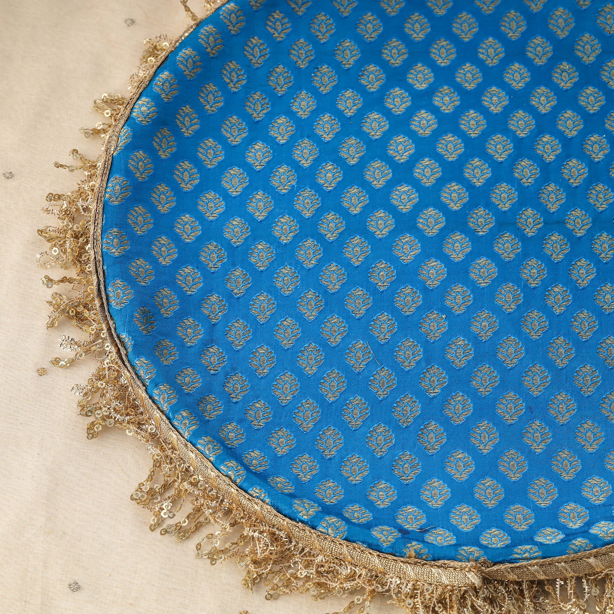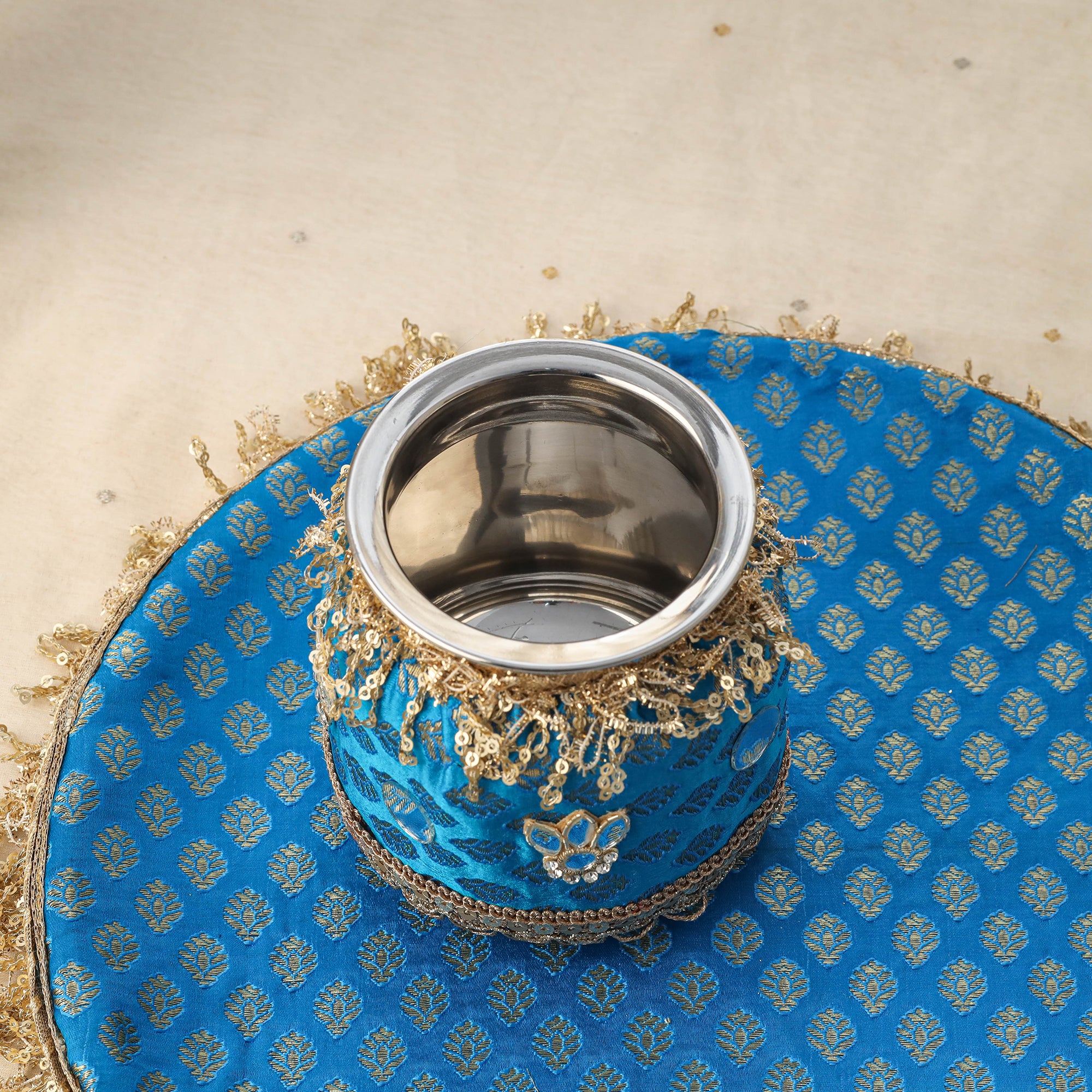 This banarasi karwa chauth thali set is a must-have for your festive celebrations. Made from sturdy stainless steel, it is beautifully covered with rich banarasi fabric and decorated with delicate mirror and lace work. The elegant design adds charm to your rituals and makes the set durable and long-lasting. Perfect for Karwa Chauth pooja, this exquisite thali set enhances the traditional atmosphere and completes your festive look with grace.