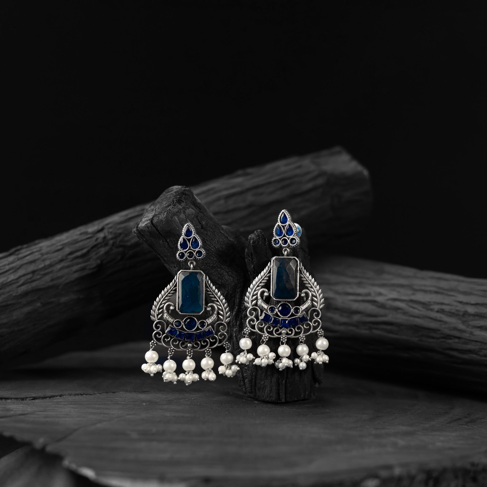 Oxidised handcrafted blue earrings made with a blend of metal, stones, pearls, beads, and fine detailing. Perfect for festive occasions, weddings, casual outings, office wear, or vacations. Their elegant black and silver tones pair beautifully with everything from casual jeans and flowy dresses to chic office ensembles. A meaningful gift for mother, sister, wife, or girlfriend adding a beautiful touch of tradition to every moment.