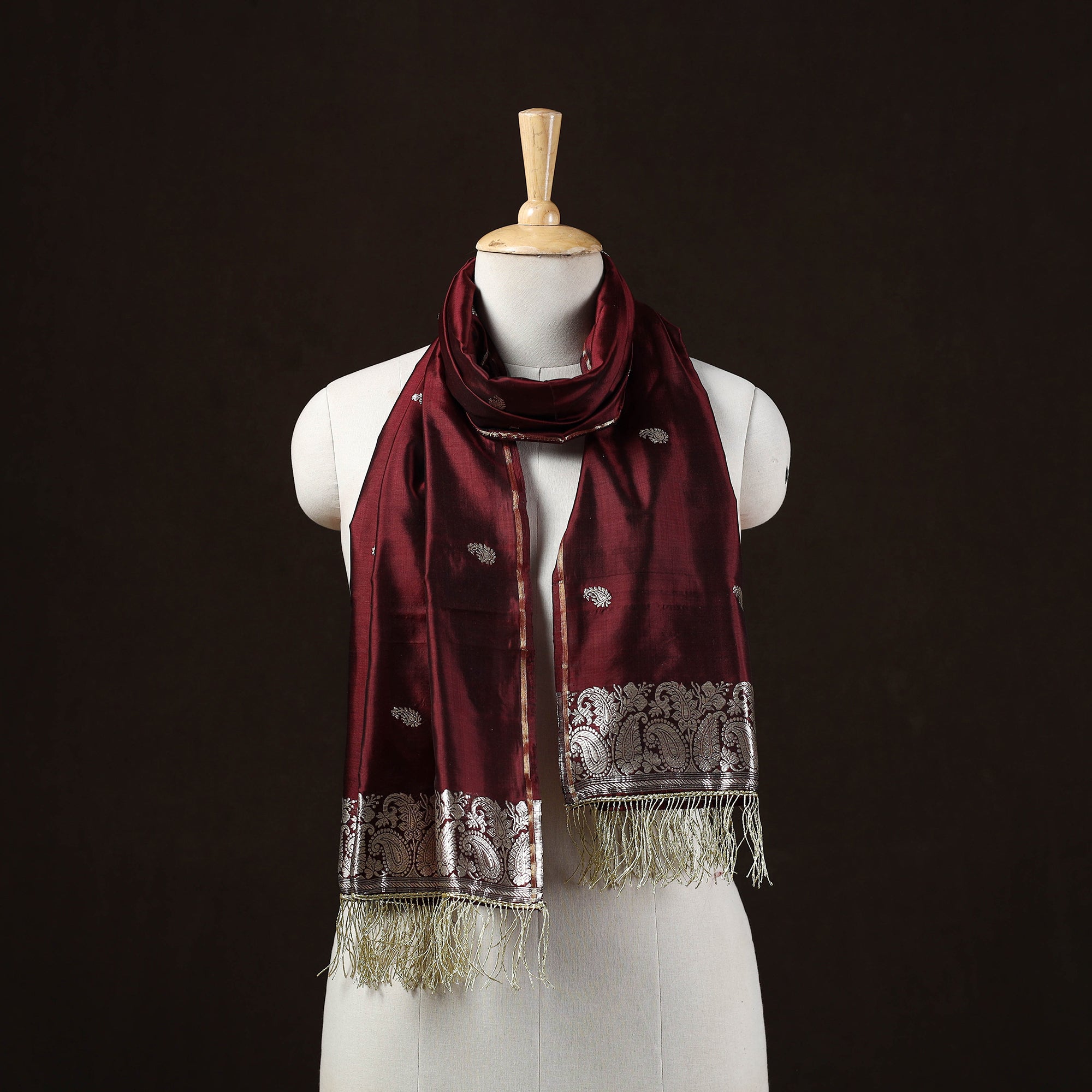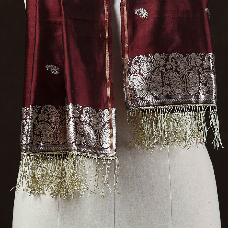 Maroon banarasi silk stole with tassels is woven on a handloom by skilled artisans of Alishba Creation in Banaras. Featuring rich brocade patterns highlighted with zari work, its pure silk base gives it a graceful fall. Thoughtfully made, this stole pairs beautifully with ethnic and fusion outfits, adding Banarasi elegance to everyday and occasion wear.