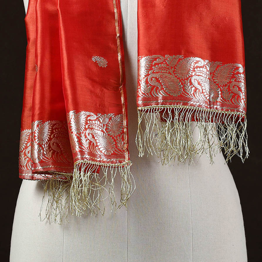 Orange banarasi silk stole with tassels is woven on a handloom by skilled artisans of Alishba Creation in Banaras. Featuring rich brocade patterns highlighted with zari work, its pure silk base gives it a graceful fall. Thoughtfully made, this stole pairs beautifully with ethnic and fusion outfits, adding Banarasi elegance to everyday and occasion wear.