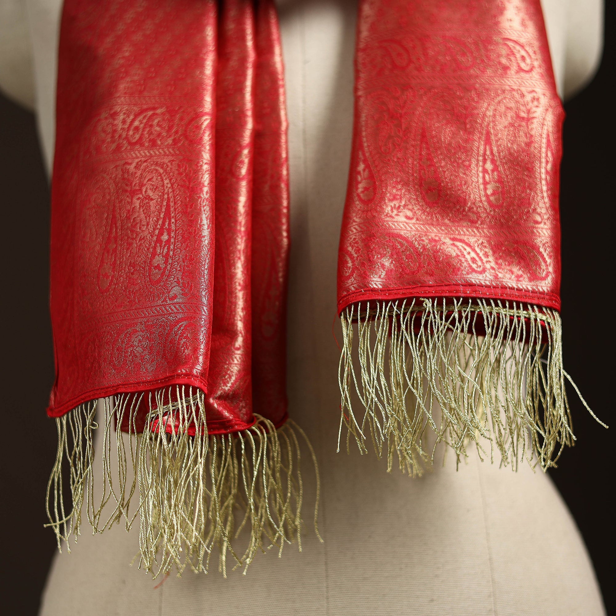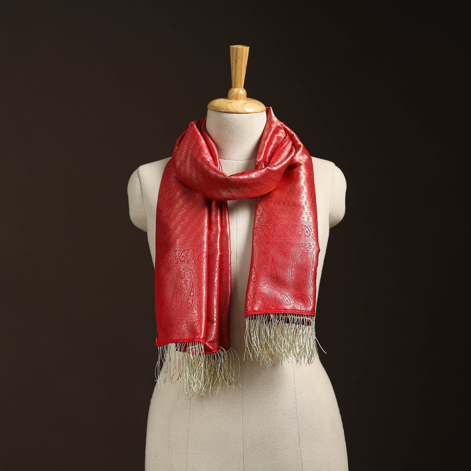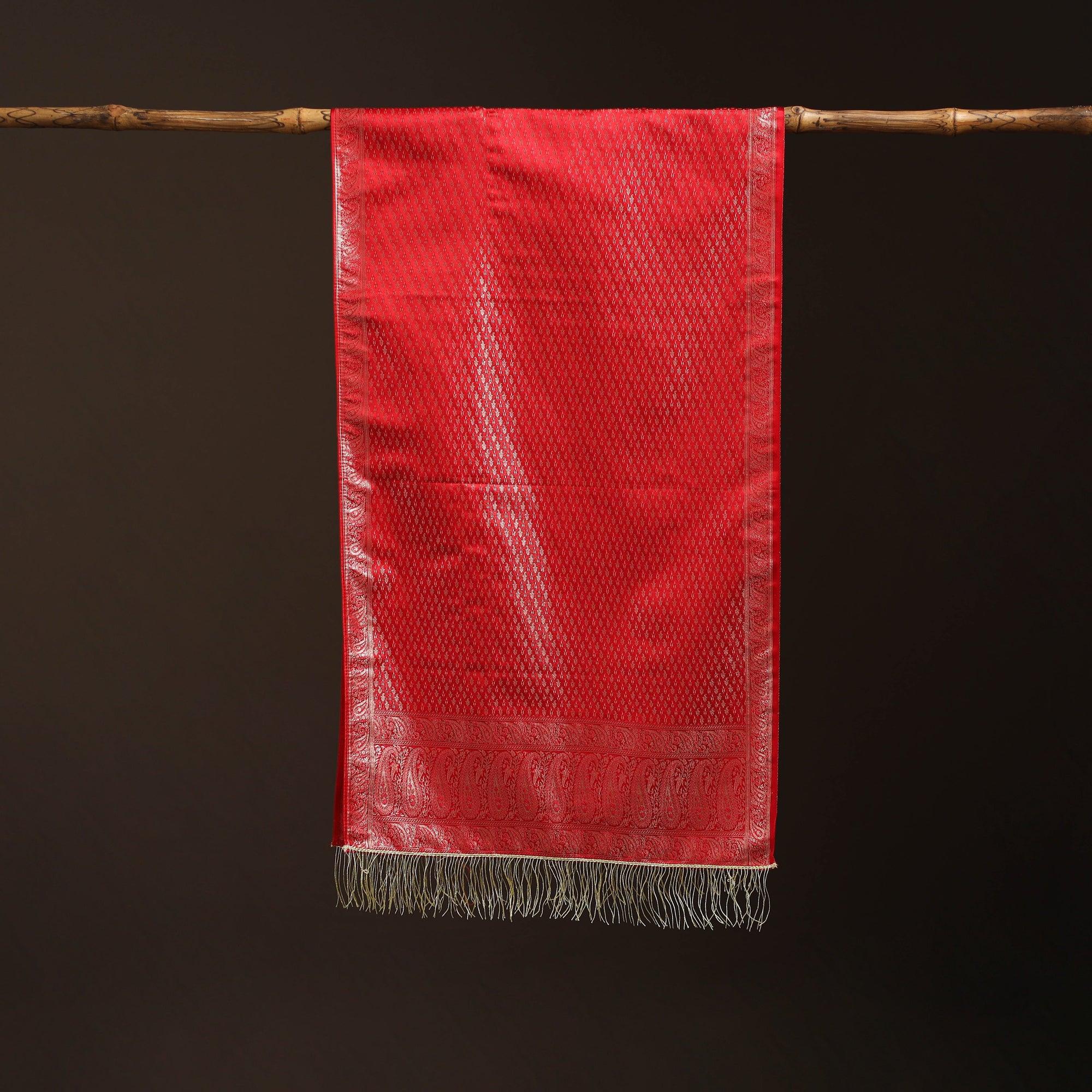 This red banarasi semi-silk brocade stole is woven by skilled artisans in Banaras. It features intricate motifs in jewel tones highlighted with gold and silver zari work. Finished with shimmering zari tassels, the stole adds a regal touch to any outfit. Light yet graceful, it pairs beautifully with both traditional and contemporary wear. A versatile accessory, it brings vibrant color and subtle shine to your wardrobe with ease.