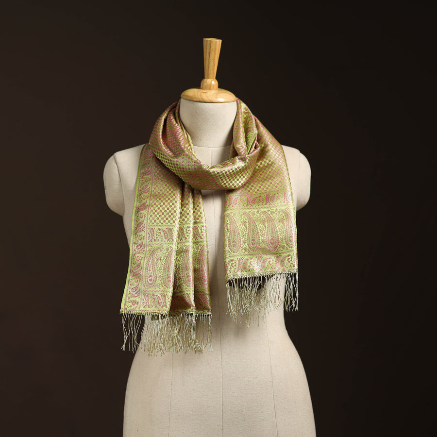 This green banarasi semi-silk brocade stole is woven by skilled artisans in Banaras. It features intricate motifs in jewel tones highlighted with gold and silver zari work. Finished with shimmering zari tassels, the stole adds a regal touch to any outfit. Light yet graceful, it pairs beautifully with both traditional and contemporary wear. A versatile accessory, it brings vibrant color and subtle shine to your wardrobe with ease.