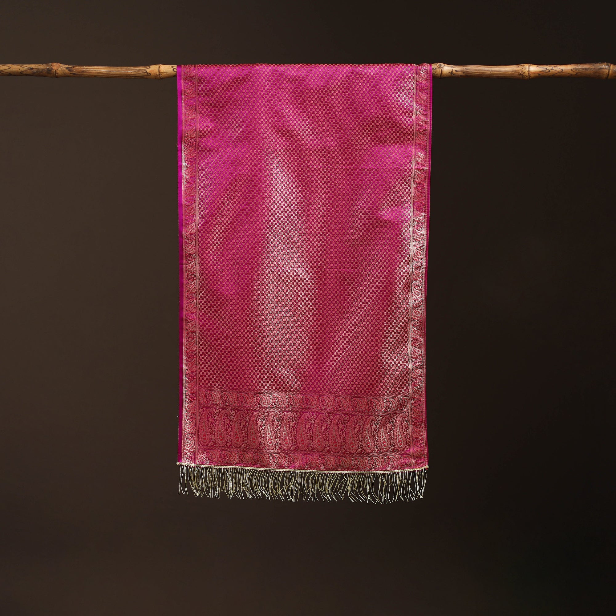This pink banarasi semi-silk brocade stole is woven by skilled artisans in Banaras. It features intricate motifs in jewel tones highlighted with gold and silver zari work. Finished with shimmering zari tassels, the stole adds a regal touch to any outfit. Light yet graceful, it pairs beautifully with both traditional and contemporary wear. A versatile accessory, it brings vibrant color and subtle shine to your wardrobe with ease.