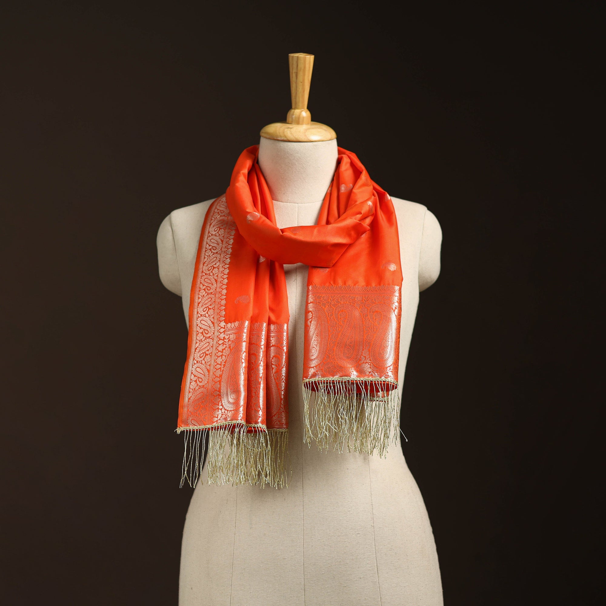 This orange banarasi semi-silk brocade stole is woven by skilled artisans in Banaras. It features intricate motifs in jewel tones highlighted with gold and silver zari work. Finished with shimmering zari tassels, the stole adds a regal touch to any outfit. Light yet graceful, it pairs beautifully with both traditional and contemporary wear. A versatile accessory, it brings vibrant color and subtle shine to your wardrobe with ease.