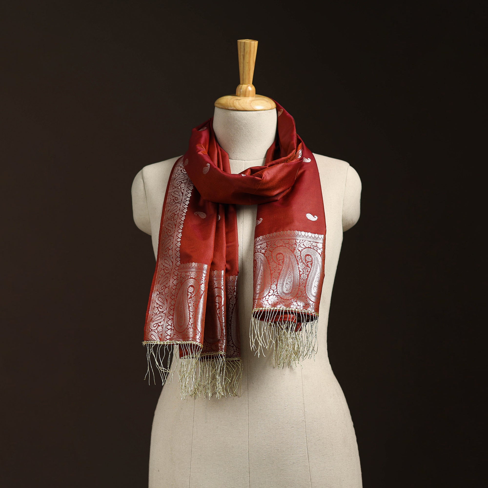 This red banarasi semi-silk brocade stole is woven by skilled artisans in Banaras. It features intricate motifs in jewel tones highlighted with gold and silver zari work. Finished with shimmering zari tassels, the stole adds a regal touch to any outfit. Light yet graceful, it pairs beautifully with both traditional and contemporary wear. A versatile accessory, it brings vibrant color and subtle shine to your wardrobe with ease.