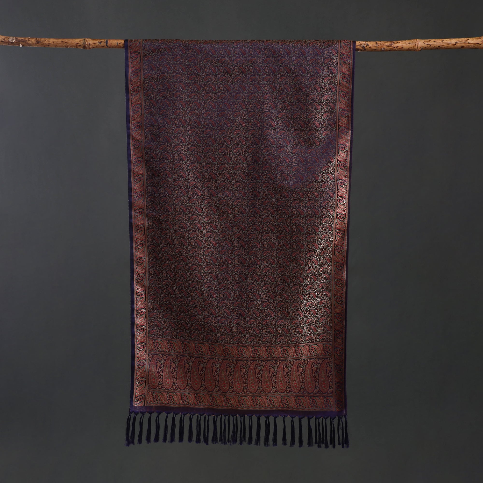 Banarasi semi silk brocade stole is woven by the skilled artisans of Maqbul Hasan in Banaras, continuing a weaving tradition that has been practiced in the region for thousands of years. Known for its detailed brocade patterns, the stole features intricate motifs in rich jewel tones, enhanced with gold and silver zari work. Finished with shimmering zari tassels along the edges, this stole adds a graceful and regal touch to festive and traditional outfits.