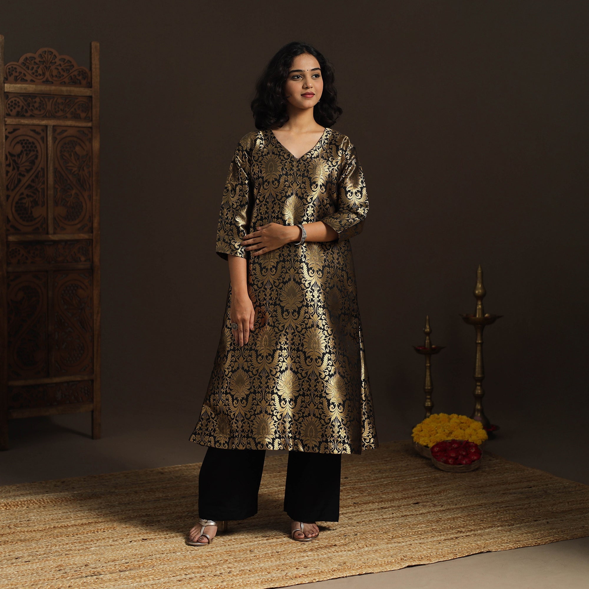 Step into elegance with this black a-line banarasi kurta, crafted from brocade zari art silk fabric. Adorned with a delicate zari design, the fabric shines in vibrant jewel tones, adding a touch of sophistication to your ensemble. The kurta also features a convenient side pocket, perfect for carrying small essentials. A versatile piece, it’s an ideal choice for both casual and festive occasions.