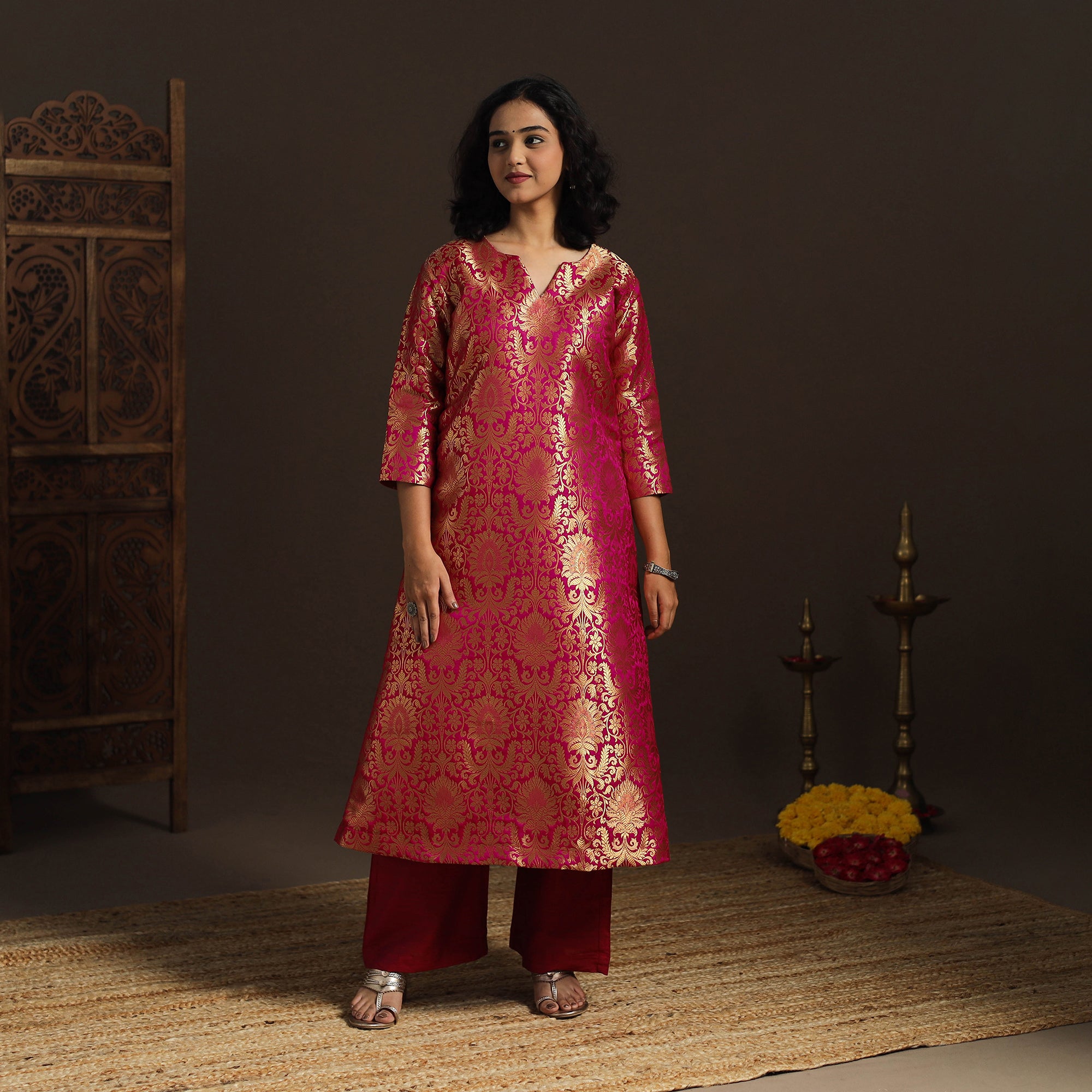 Step into elegance with this pink a-line banarasi kurta, crafted from brocade zari art silk fabric. Adorned with a delicate zari design, the fabric shines in vibrant jewel tones, adding a touch of sophistication to your ensemble. The kurta also features a convenient side pocket, perfect for carrying small essentials. A versatile piece, it’s an ideal choice for both casual and festive occasions.