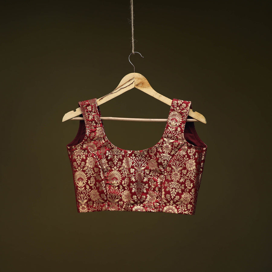 This maroon banarasi brocade art silk stitched blouse showcases intricate zari motifs in rich jewel tones. Perfect for festive occasions, weddings, or custom styling, it gracefully balances tradition with refined elegance. The blouse features a secure back hook closure for ease of wear, making it a versatile addition to any wardrobe.