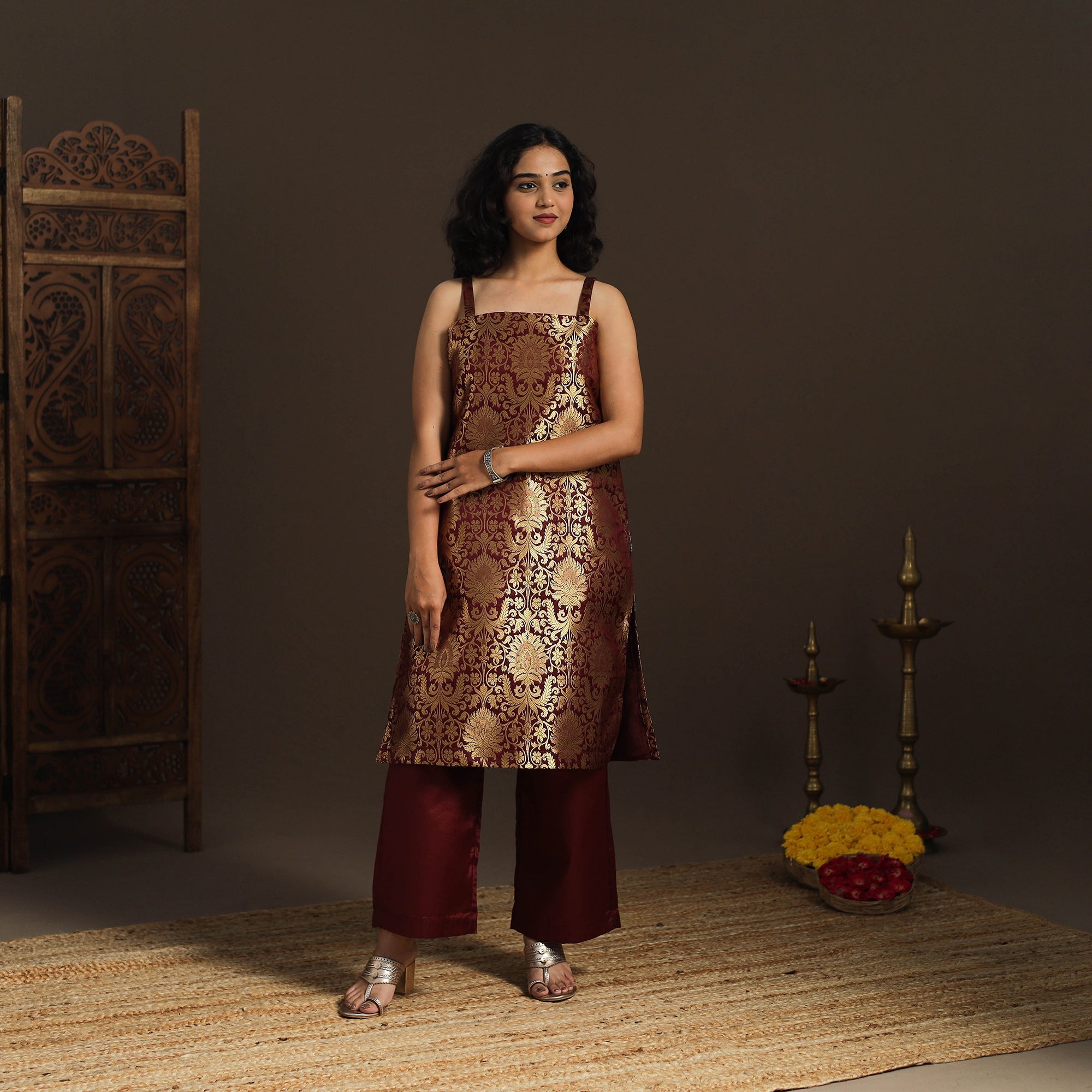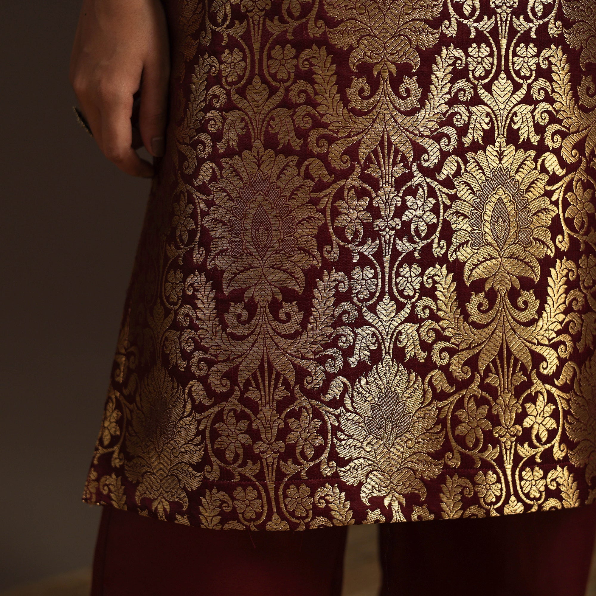 Step into elegance with this maroon straight banarasi sleeveless kurta, crafted from brocade zari art silk fabric. Adorned with a delicate zari design, the fabric shines in vibrant jewel tones, adding a touch of sophistication to your ensemble. The kurta also features a convenient side pocket, perfect for carrying small essentials. A versatile piece, it’s an ideal choice for both casual and festive occasions.