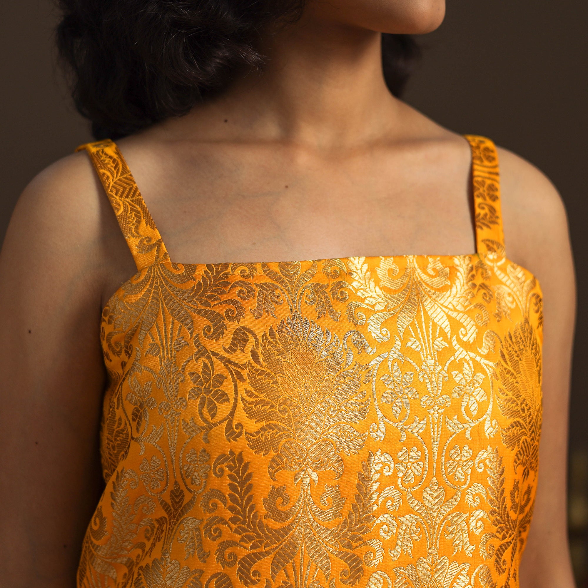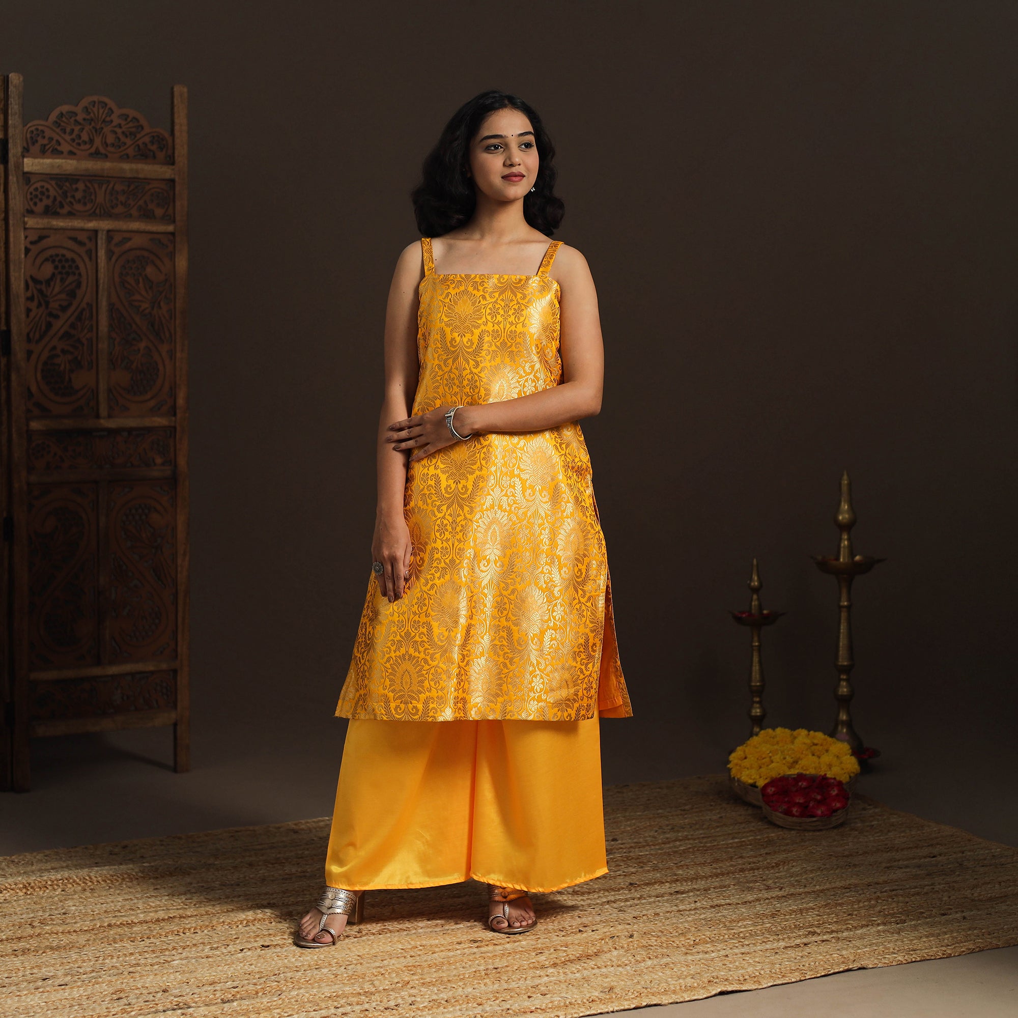 Step into elegance with this yellow straight banarasi sleeveless kurta, crafted from brocade zari art silk fabric. Adorned with a delicate zari design, the fabric shines in vibrant jewel tones, adding a touch of sophistication to your ensemble. The kurta also features a convenient side pocket, perfect for carrying small essentials. A versatile piece, it’s an ideal choice for both casual and festive occasions.