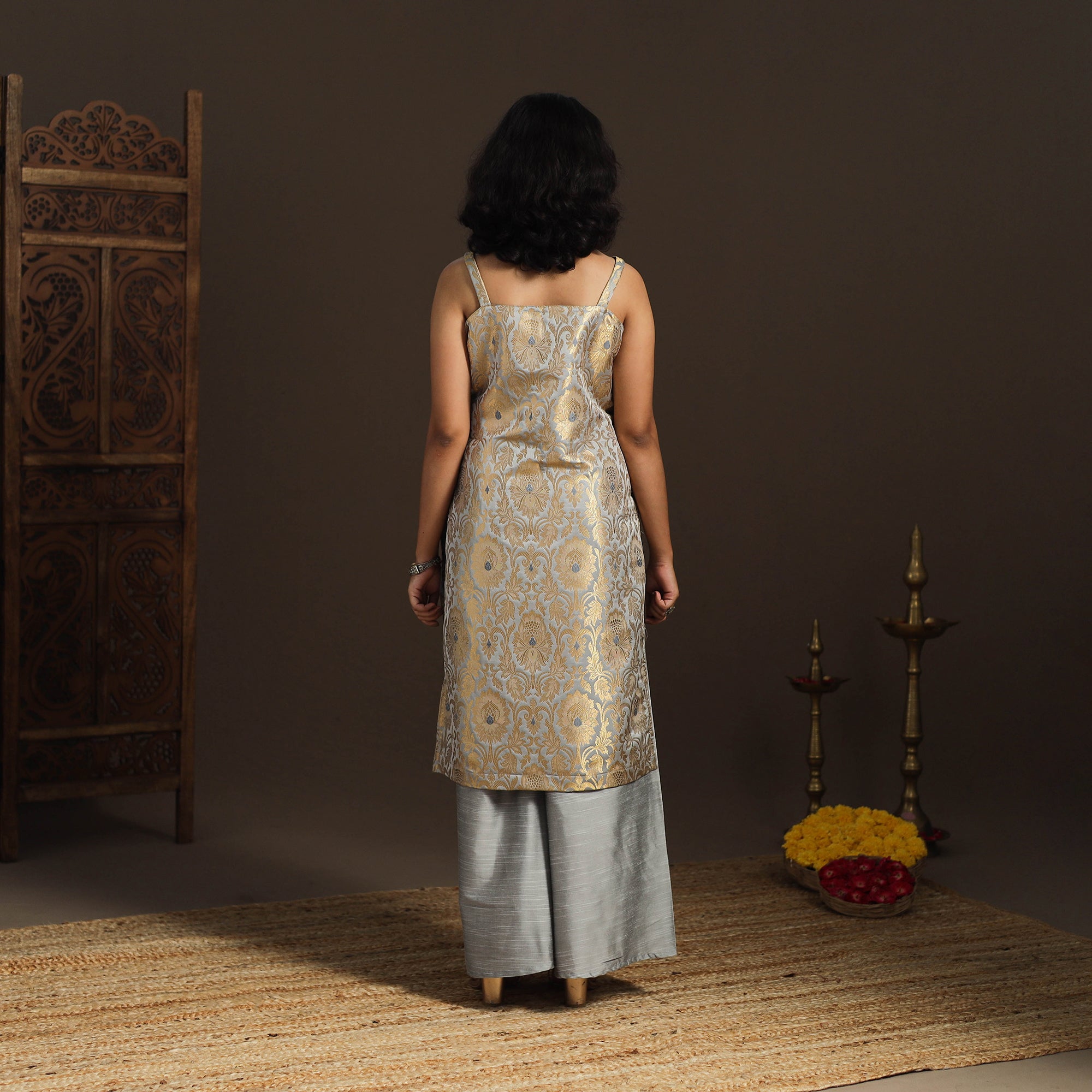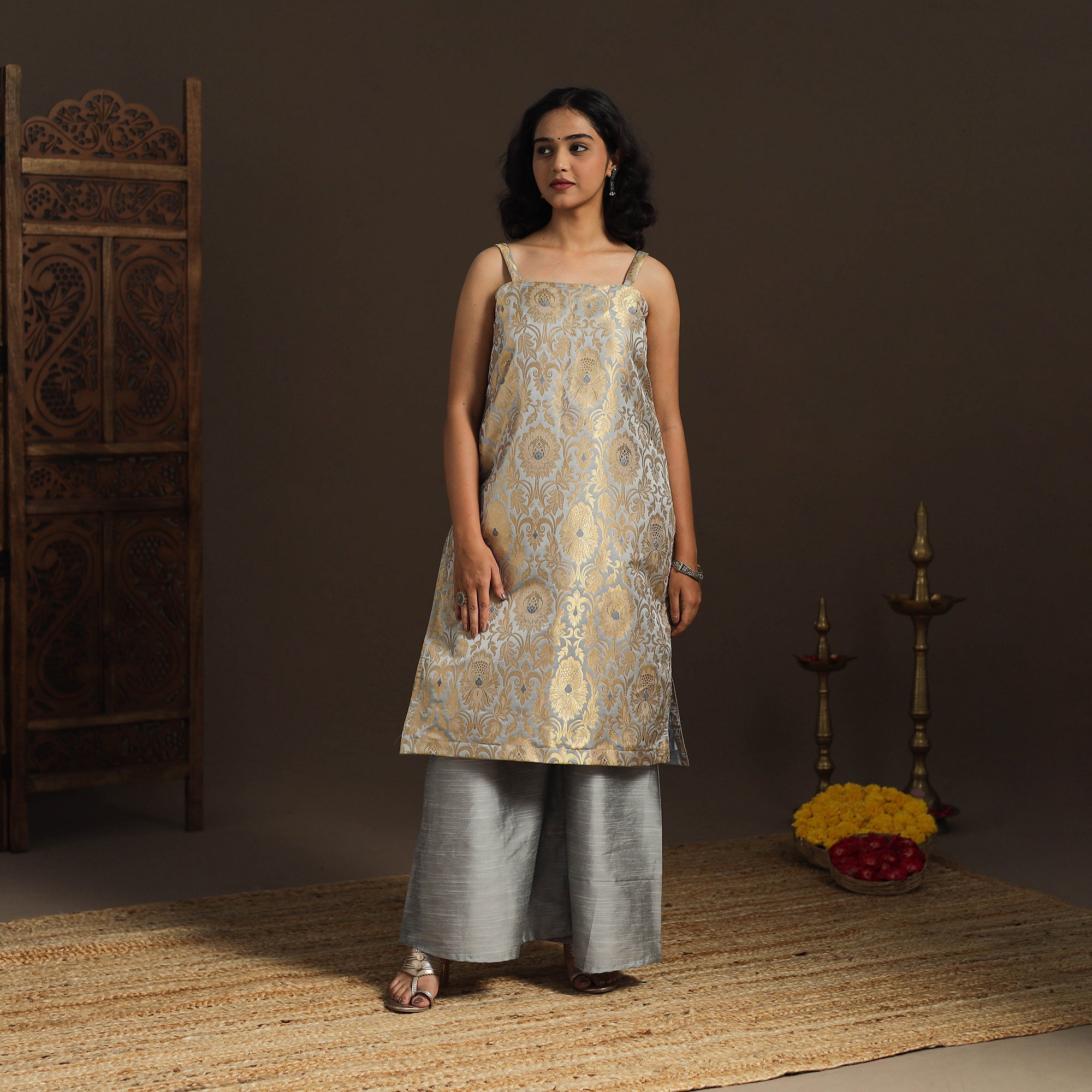 Step into elegance with this grey straight banarasi sleeveless kurta, crafted from brocade zari art silk fabric. Adorned with a delicate zari design, the fabric shines in vibrant jewel tones, adding a touch of sophistication to your ensemble. The kurta also features a convenient side pocket, perfect for carrying small essentials. A versatile piece, it’s an ideal choice for both casual and festive occasions.