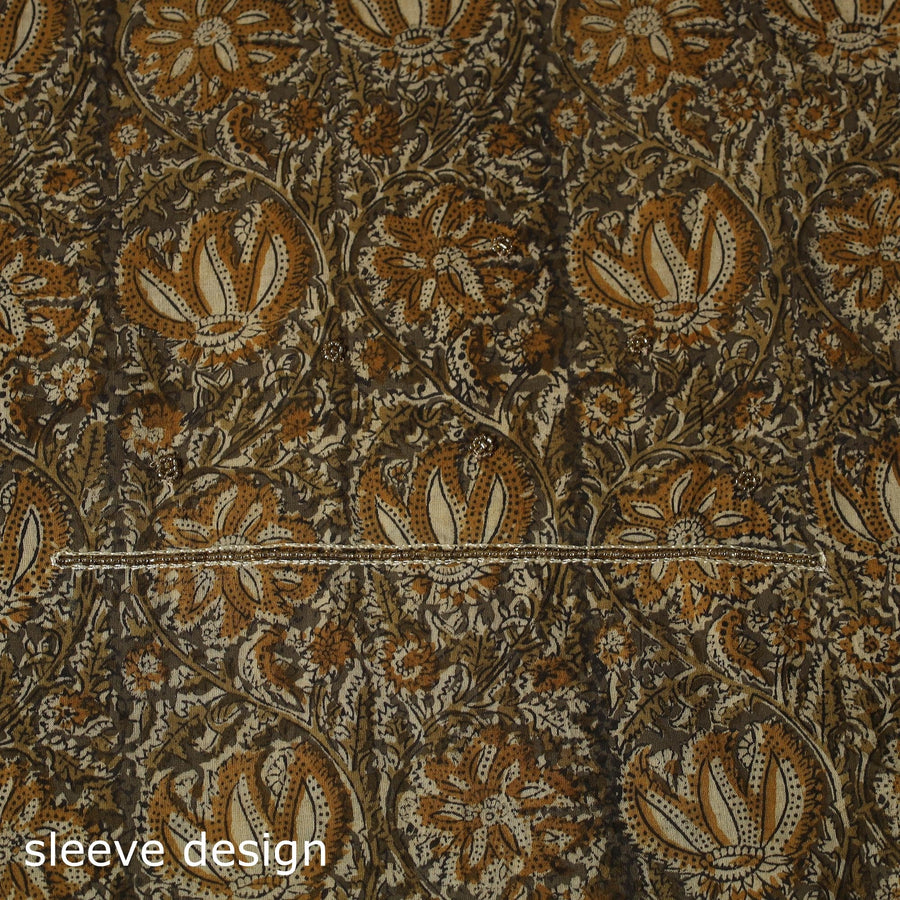 Fine quality bead work, hand embroidery, kalamkari block printed, cotton kurta material made using natural dyes through the traditional process of hand block printed practised by the master artisans. Showcasing an assortment of hand block printed motifs inspired by traditional kalamkari painted. Kalamkari is the earliest and more complex techniques of block-printed.