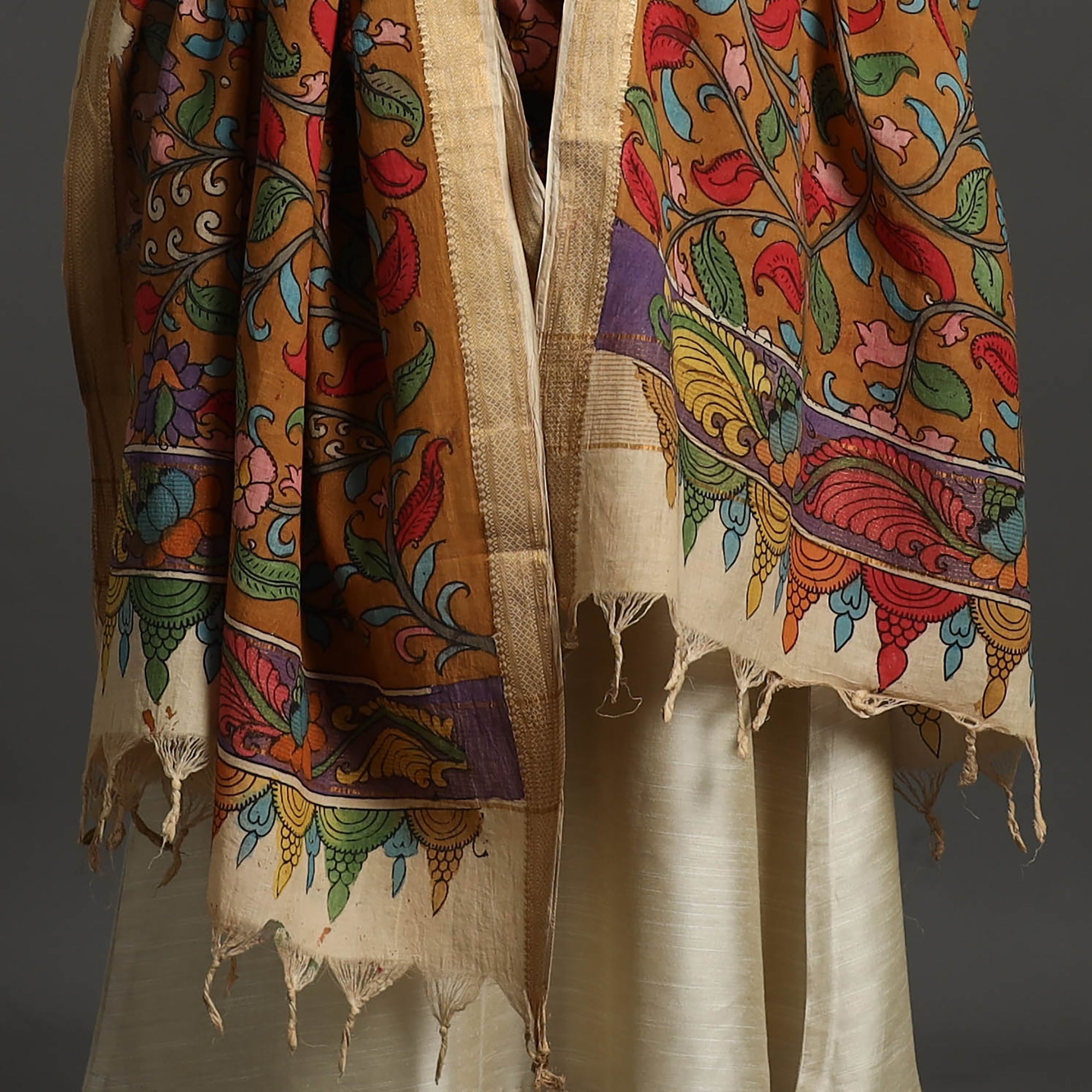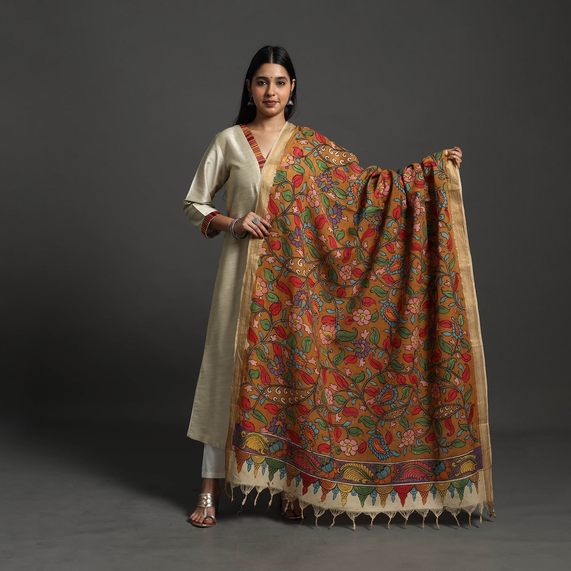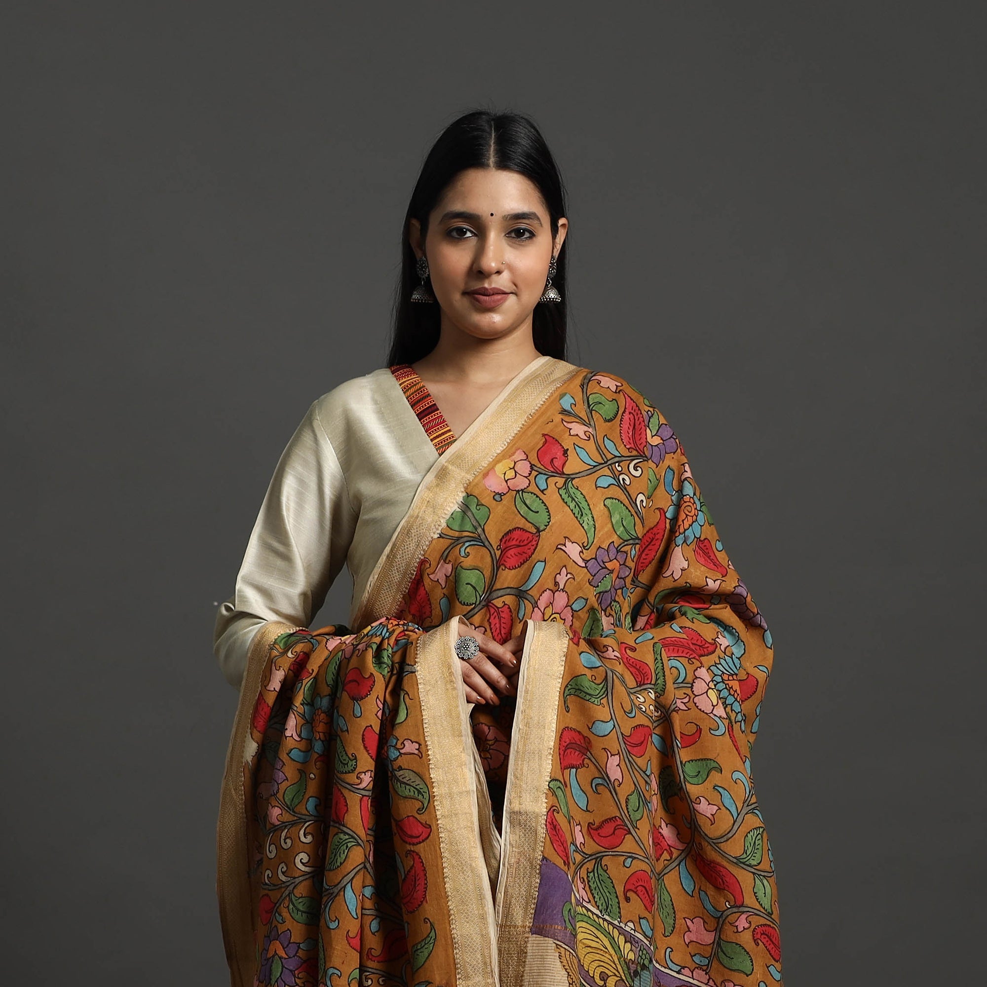 Step into the world of heritage crafts with this srikalahasti handpainted mangalagiri cotton pen work kalamkari dupatta. Made from handloom cotton and handpainted using traditional kalam (pen), this dupatta showcases the legacy of 200 year old artistry. Artisans of Srikalahasti continue the ancient techniques of natural dyeing and freehand painting. Adorned with a zari border and tassels, this exquisite dupatta making it a sophisticated addition to your wardrobe.