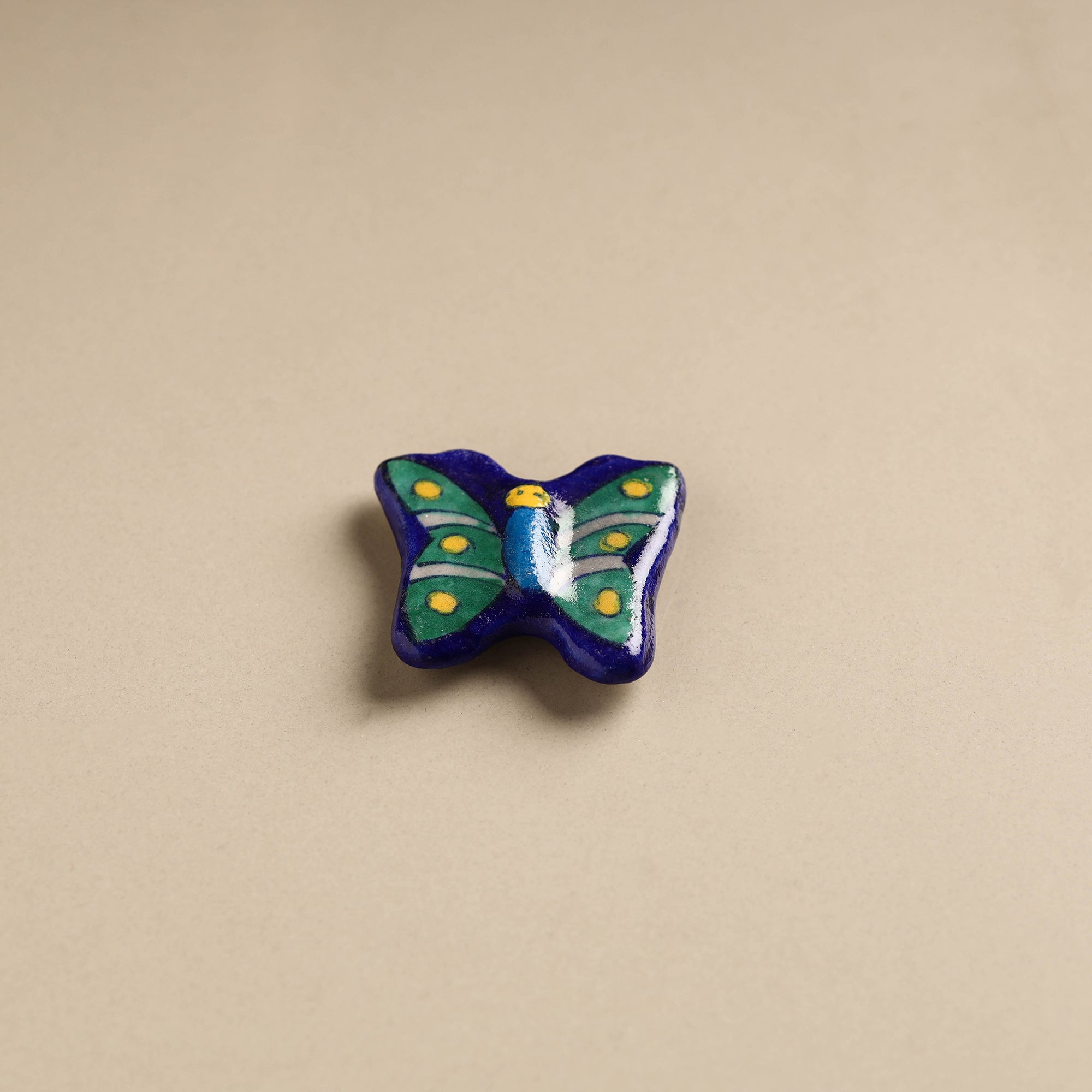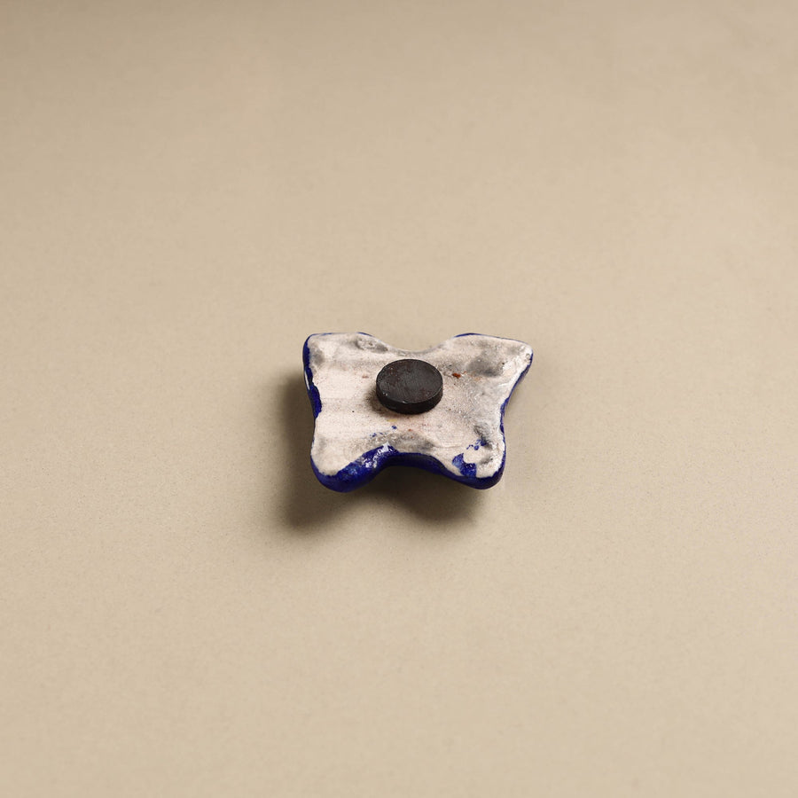 This original blue pottery ceramic tile blue butterfly fridge magnet is handmade in Jaipur. This traditional craft, known for its vivid blue hues, is created using a unique clay-free mixture of quartz stone powder, powdered glass, Multani Mitti (Fuller's Earth), borax, gum and water. Blue pottery is widely recognized as a traditional craft of Jaipur, though it is Turko-Persian in origin. This magnet is perfect for home decor or gifting.