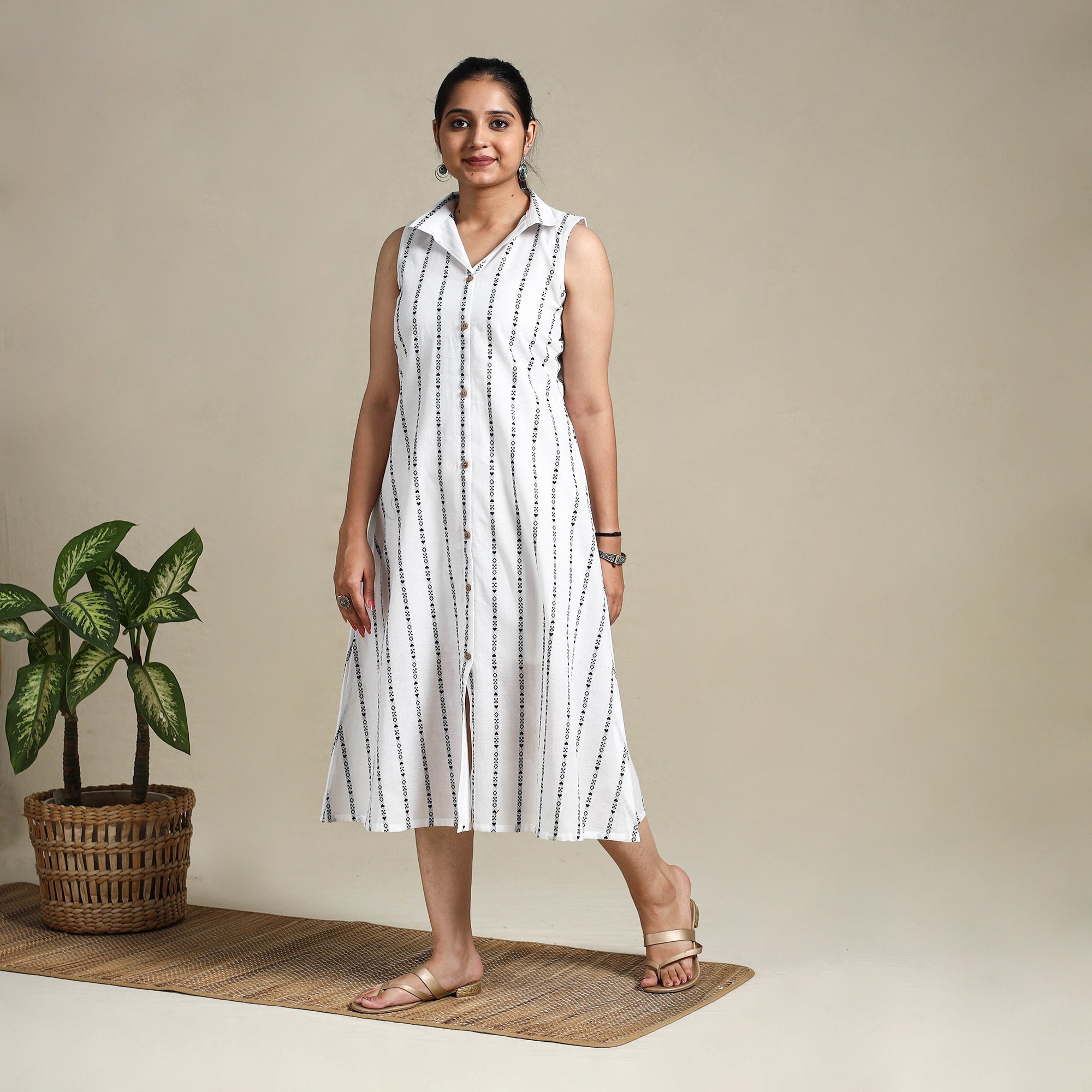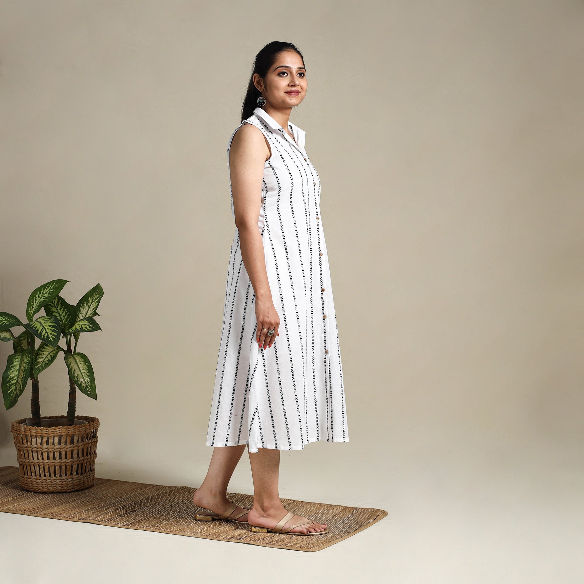 This white cotton sleeveless jacquard dress blends traditional weaving with modern elegance. Crafted by skilled artisans, it showcases the richness of jacquard, a weaving technique known for its intricate patterns. The breathable cotton fabric ensures all-day comfort, while the graceful collared neckline and button-down design add charm and ease to your look. Ideal for casual outings, office wear, or relaxed gatherings.