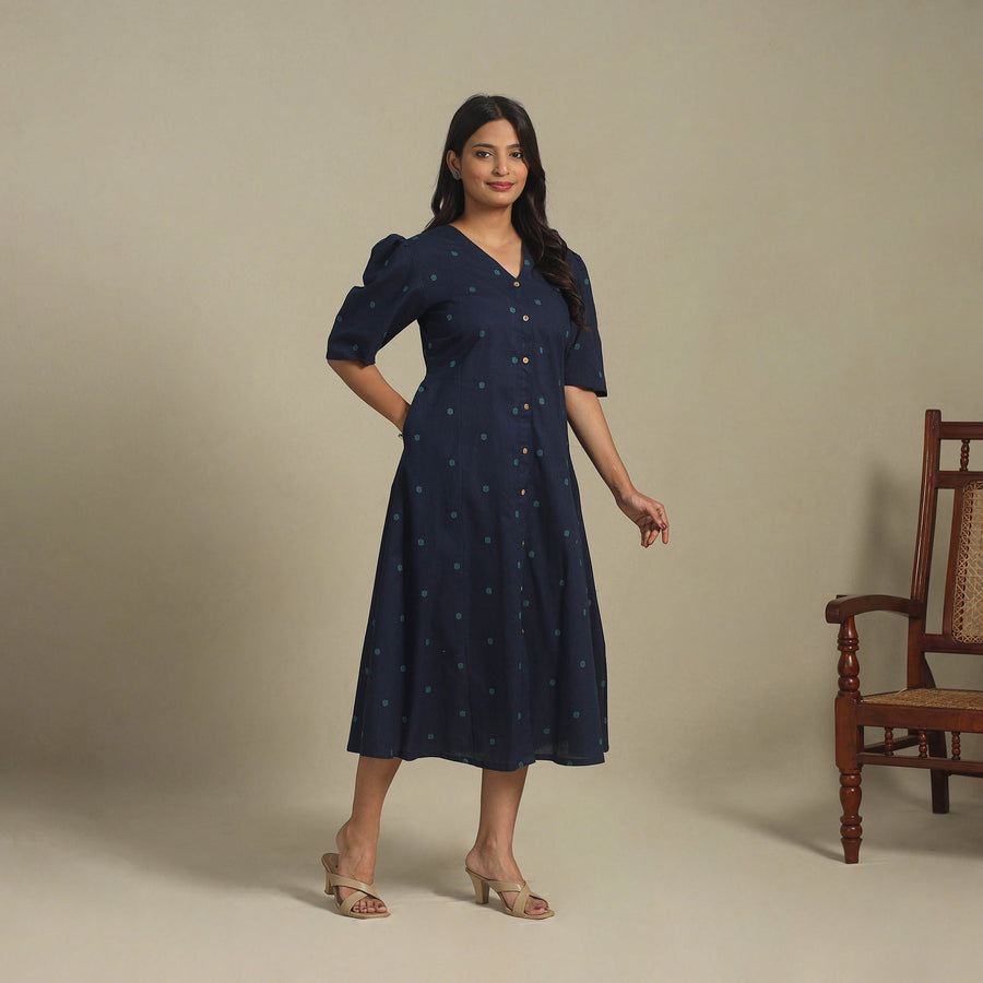 This blue cotton jacquard dress fuses traditional weaving techniques with modern aesthetics. Made from breathable cotton and detailed with intricate jacquard patterns, it offers day-long comfort. The button-down front lends subtle elegance, while side pockets add functional ease. Ideal for office wear, casual outings, or relaxed get-togethers, this dress effortlessly balances heritage with everyday practicality.