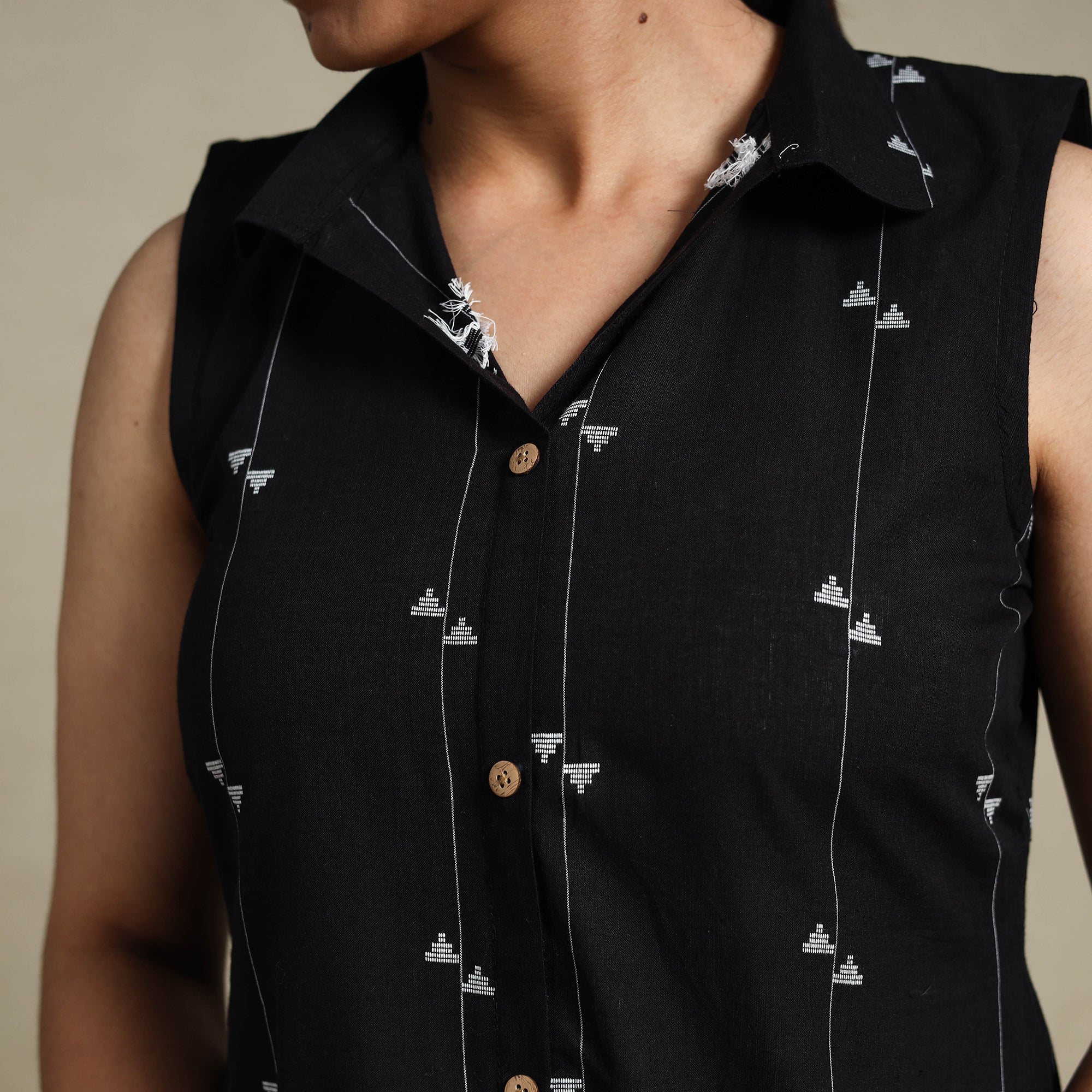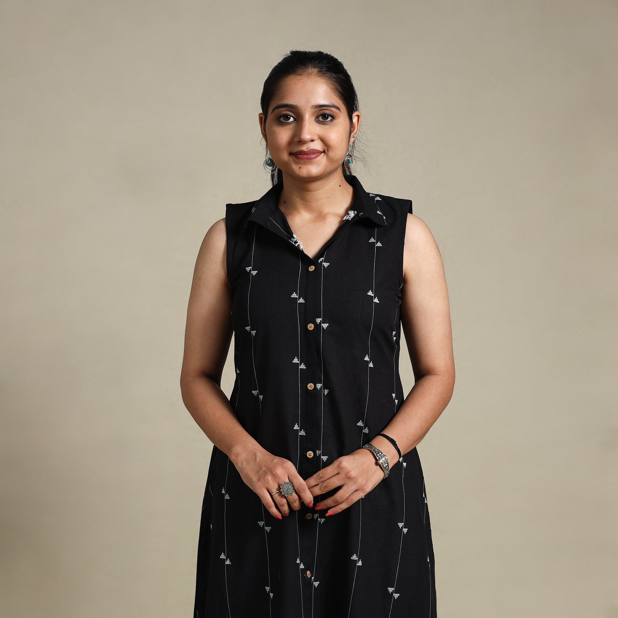 This black cotton sleeveless jacquard dress blends traditional weaving with modern elegance. Crafted by skilled artisans, it showcases the richness of jacquard, a weaving technique known for its intricate patterns. The breathable cotton fabric ensures all-day comfort, while the graceful collared neckline and button-down design add charm and ease to your look. Ideal for casual outings, office wear, or relaxed gatherings.