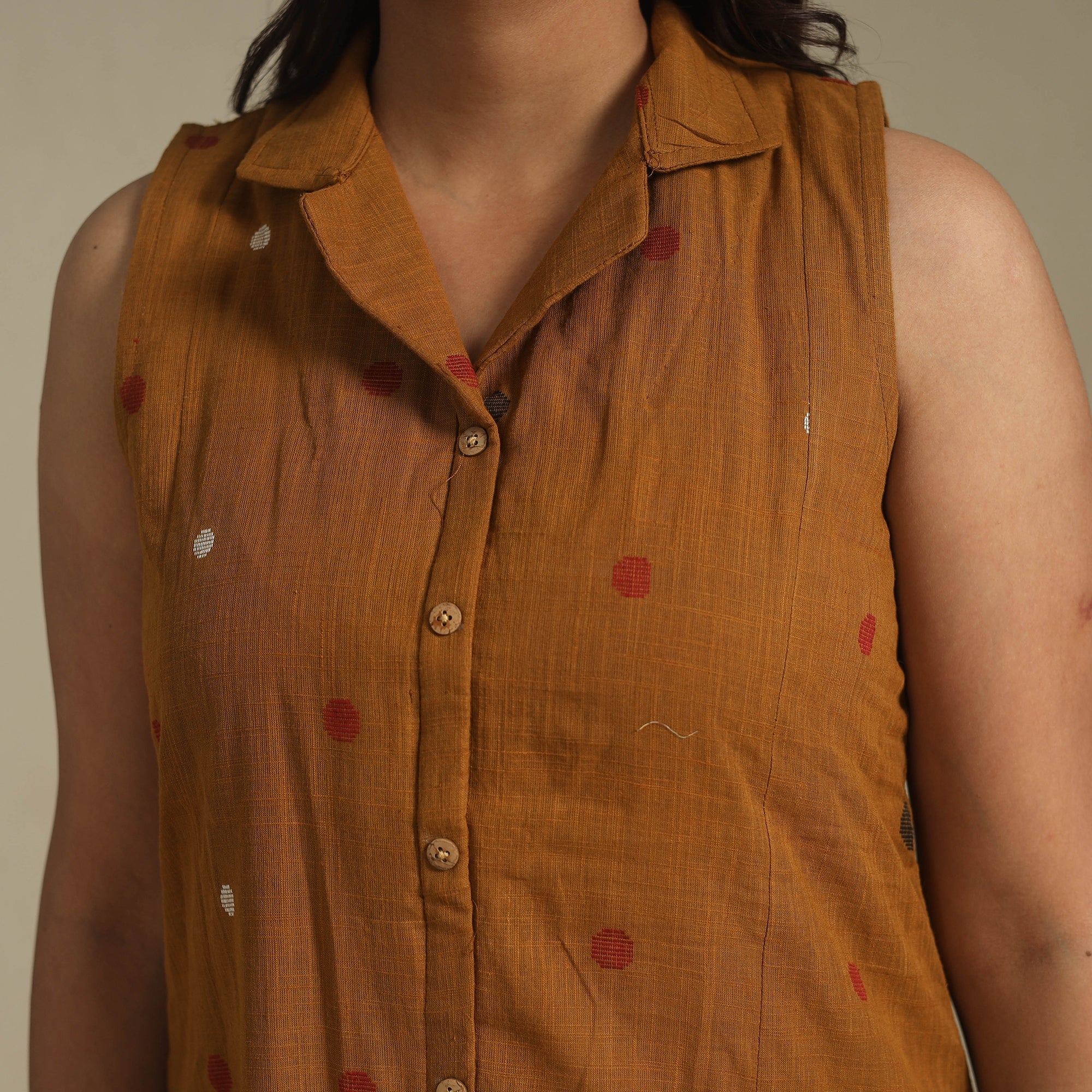 This brown sleeveless cotton jacquard dress beautifully blends traditional weaving with a modern silhouette. Crafted from breathable cotton and detailed with intricate jacquard patterns, it offers all-day comfort. The button-down front brings effortless elegance, while two front pockets add a touch of charm and utility. Ideal for office wear, casual outings, or relaxed get-togethers, this dress strikes the perfect balance between heritage and contemporary style.