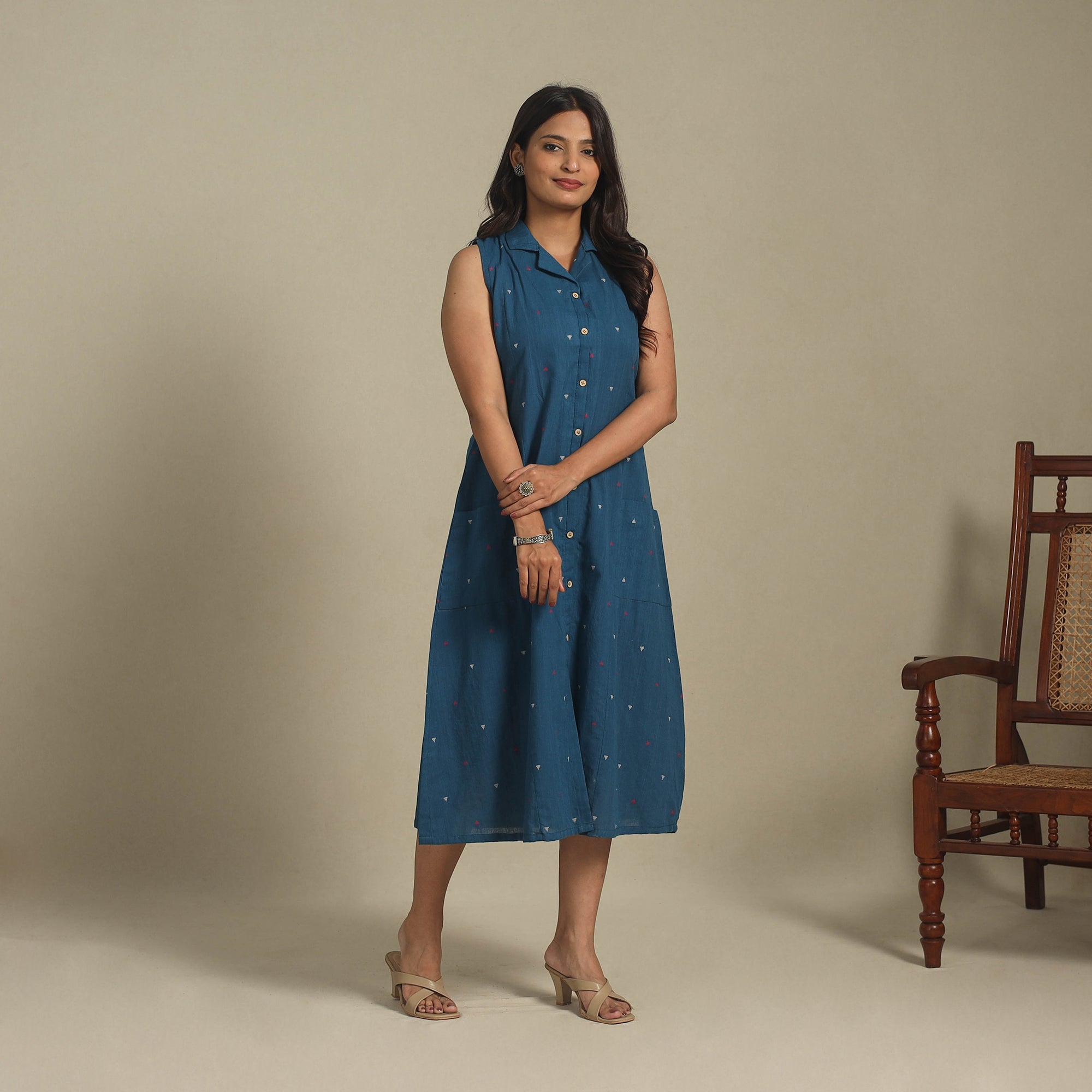 This blue sleeveless cotton jacquard dress beautifully blends traditional weaving with a modern silhouette. Crafted from breathable cotton and detailed with intricate jacquard patterns, it offers all-day comfort. The button-down front brings effortless elegance, while two front pockets add a touch of charm and utility. Ideal for office wear, casual outings, or relaxed get-togethers, this dress strikes the perfect balance between heritage and contemporary style.
