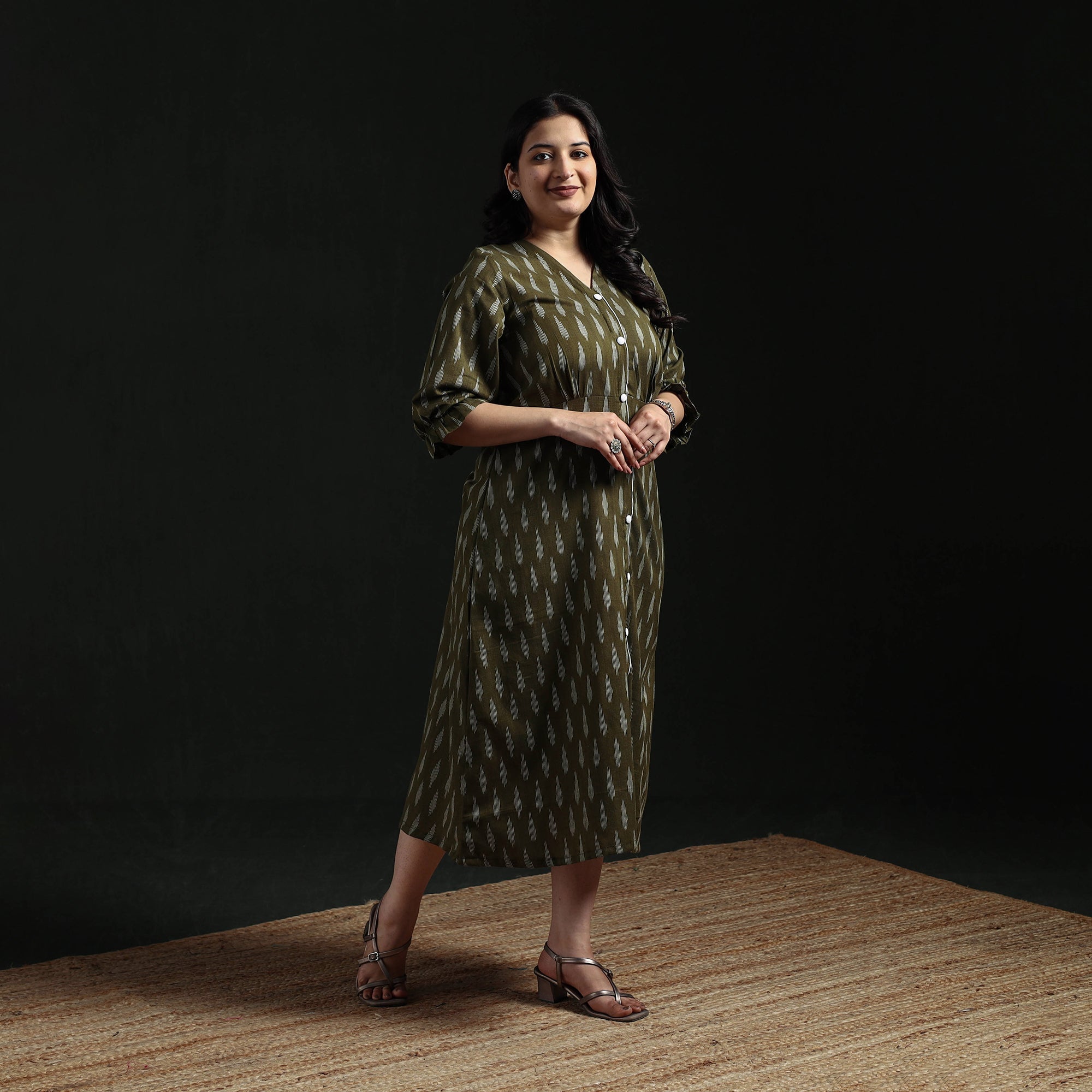 | Material | Green pochampally ikat button down dress brings together traditional craft and everyday comfort. Ikat is a centuries-old dyeing technique where patterns are made on the threads before weaving. Made in cotton and designed in a relaxed fit, this dress feels easy to wear and move in. It works well for brunches, day events, small gatherings or even relaxed workdays when you want to feel comfortable yet look neatly styled. |