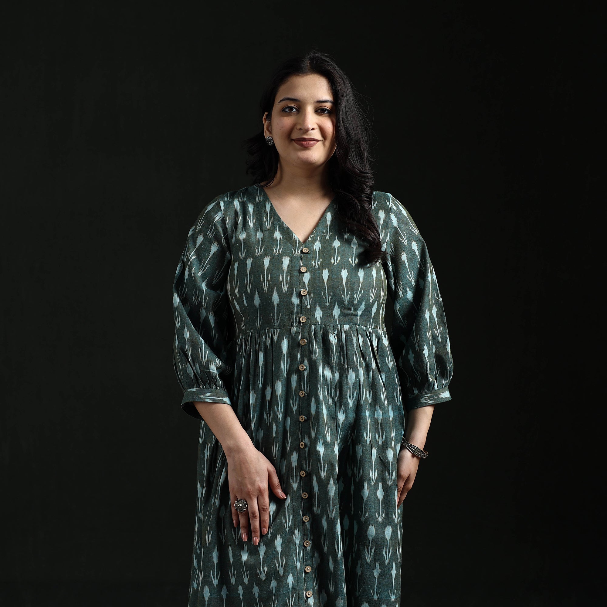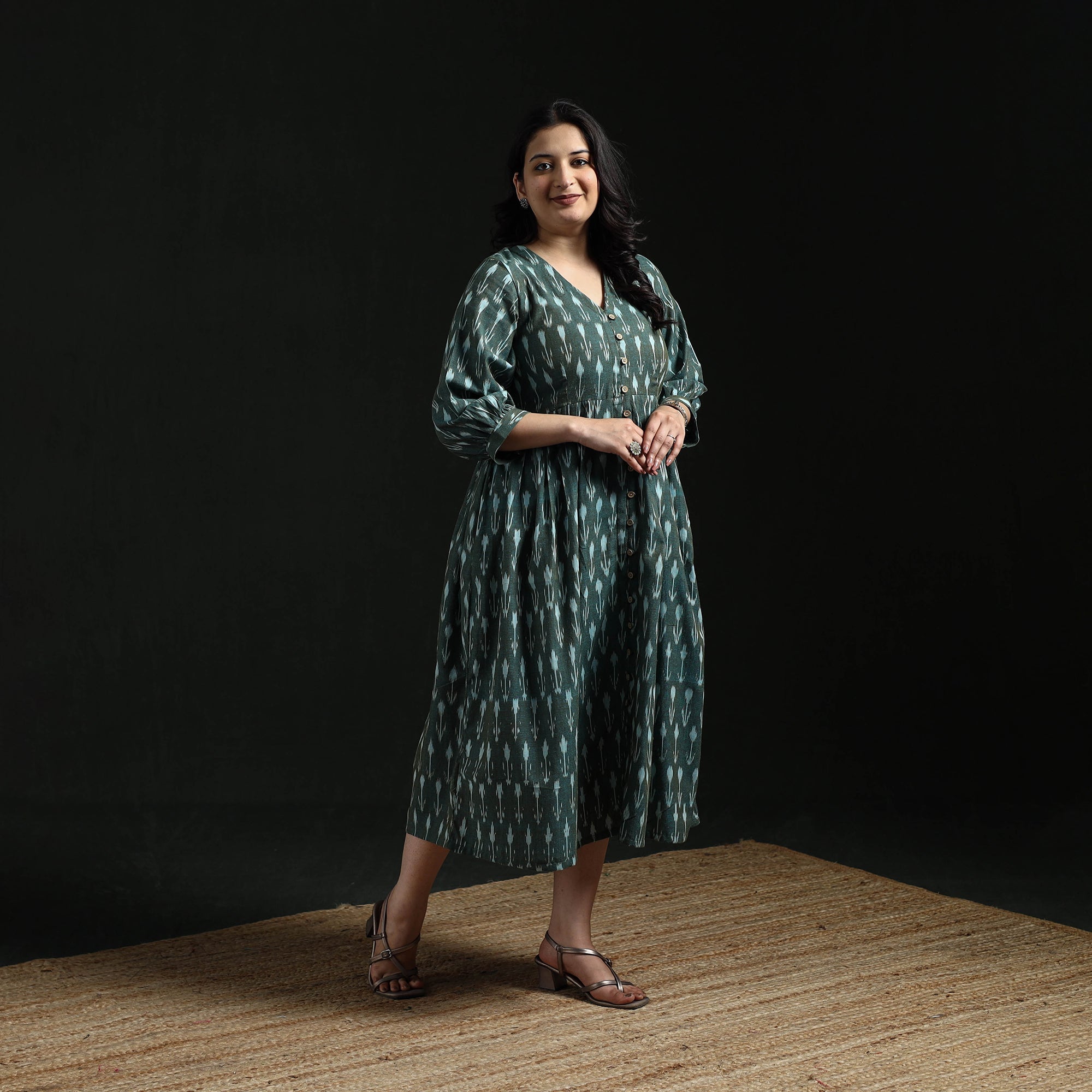 | Material | Green pochampally ikat button down flared dress brings together traditional craft and everyday comfort. Ikat is a centuries-old dyeing technique where patterns are made on the threads before weaving. Made in cotton and designed in a relaxed fit, this dress feels easy to wear and move in. It works well for brunches, day events, small gatherings or even relaxed workdays when you want to feel comfortable yet look neatly styled. |