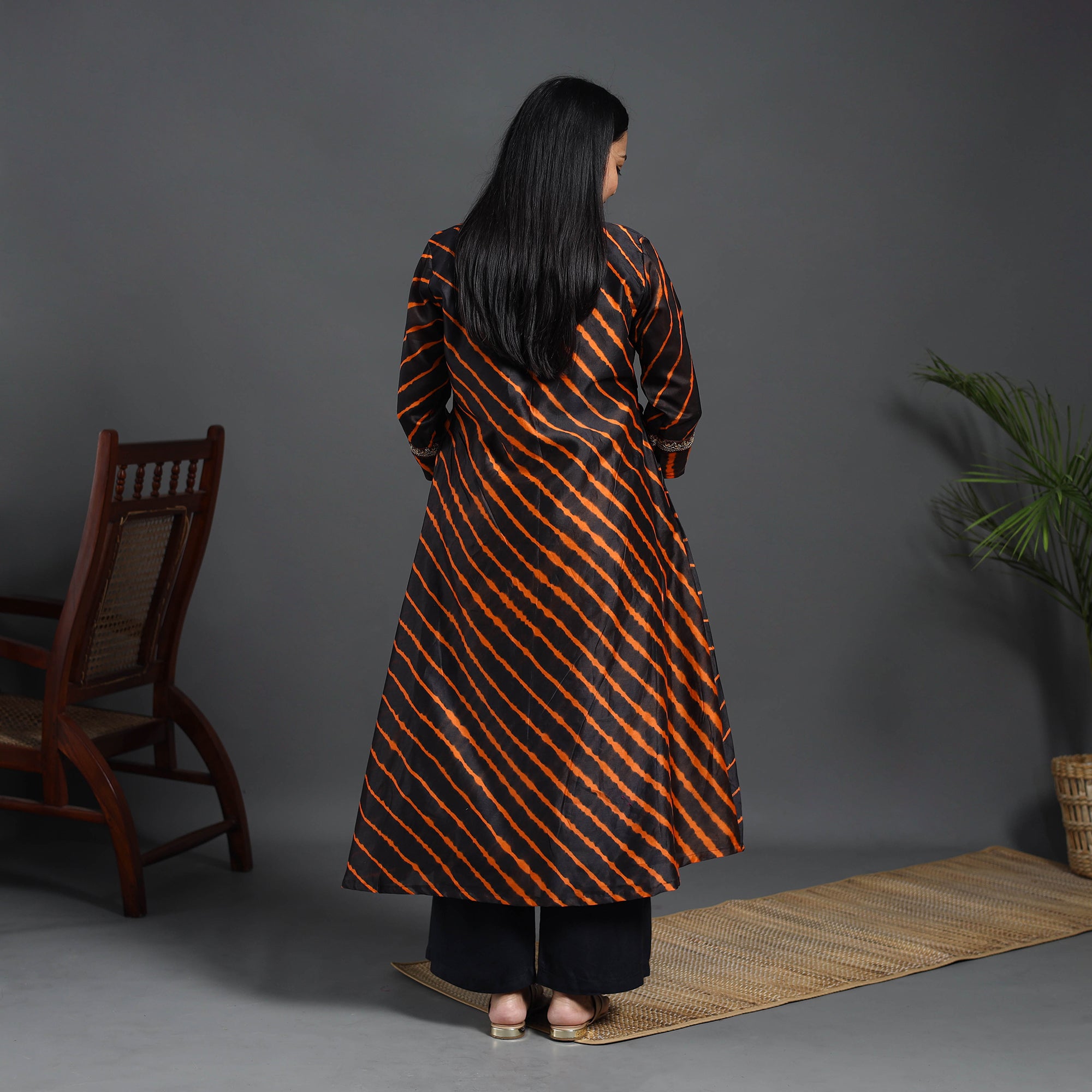 This black chanderi silk cotton a-line lacework tie-dye leheriya kurta features striking tie-dye Leheriya patterns with lacework , offering a unique touch of tradition. Made from lightweight, breathable fabric, it ensures comfort with its practical side pocket, this kurta is designed for ease and everyday utility, making it a perfect choice for adding style to your wardrobe.