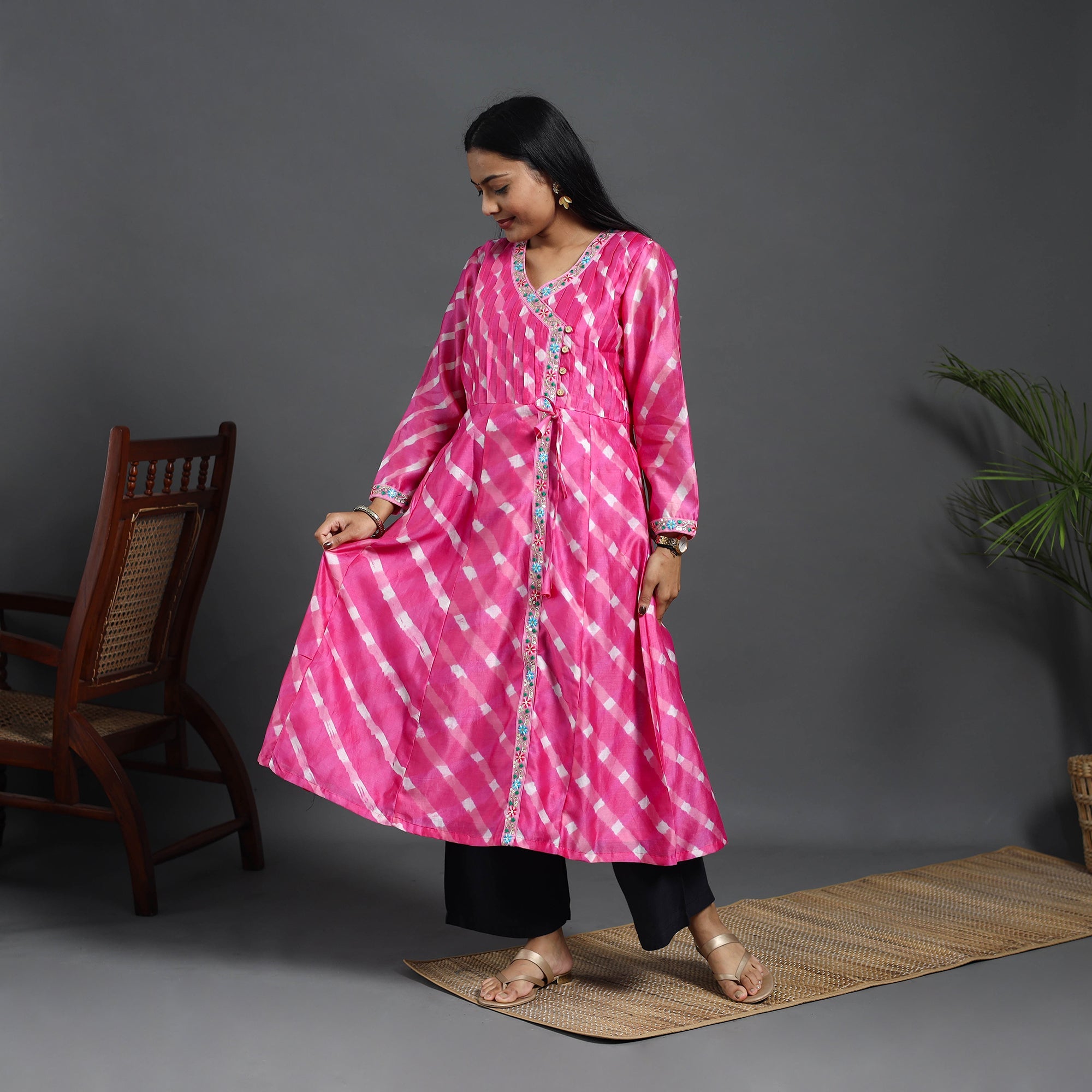 This pink chanderi silk cotton a-line lacework tie-dye leheriya kurta features striking tie-dye Leheriya patterns with lacework , offering a unique touch of tradition. Made from lightweight, breathable fabric, it ensures comfort with its practical side pocket, this kurta is designed for ease and everyday utility, making it a perfect choice for adding style to your wardrobe.