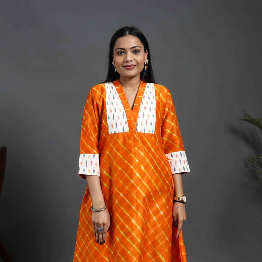This orange chanderi silk cotton a-line patchwork tie-dye leheriya kurta features tie-dye Leheriya patterns and patchwork, offering a unique touch of tradition. Made from lightweight, breathable fabric, it ensures comfort with its practical side pocket, this kurta is designed for ease and everyday utility, making it a perfect choice for adding style to your wardrobe.