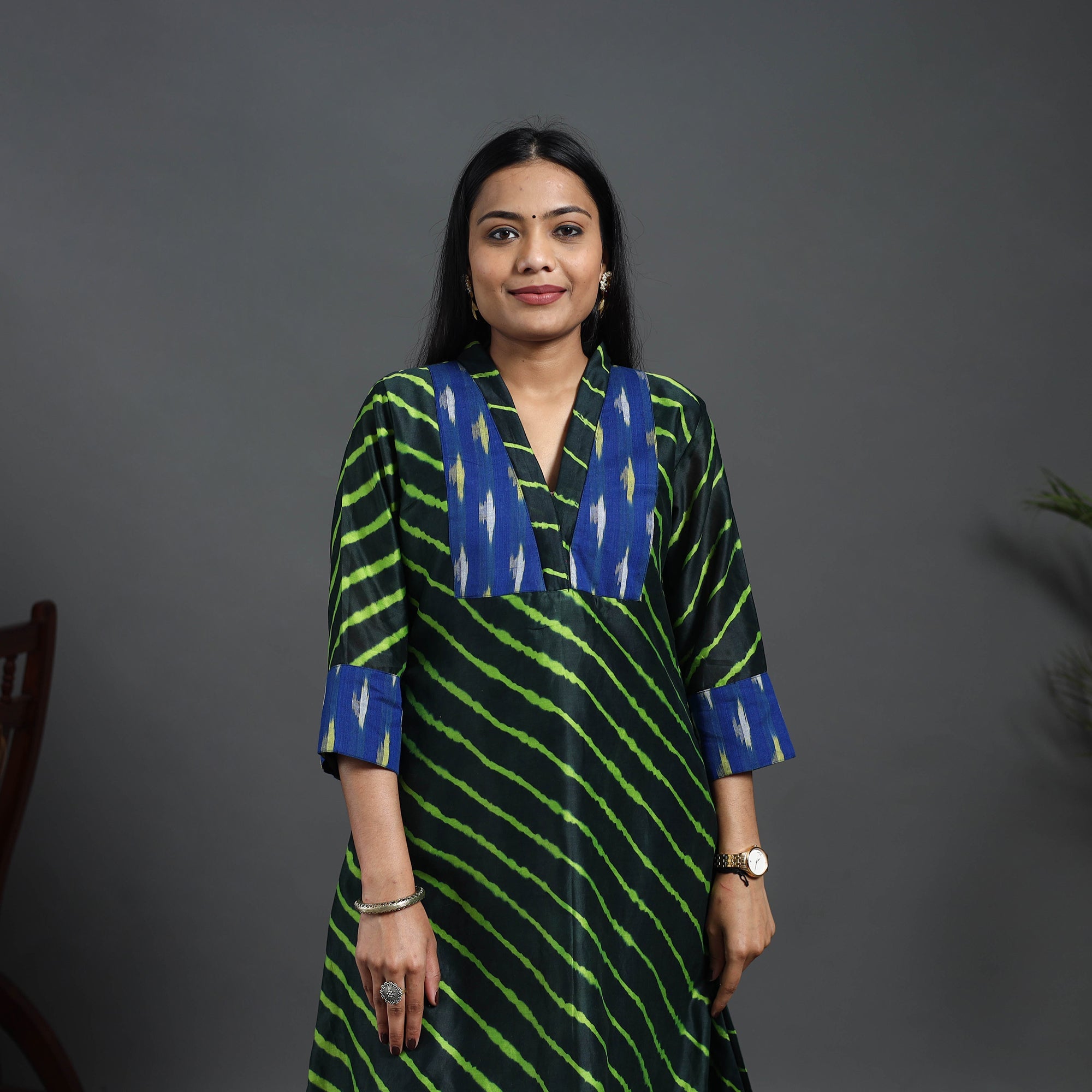 This green chanderi silk cotton a-line patchwork tie-dye leheriya kurta features tie-dye Leheriya patterns and patchwork, offering a unique touch of tradition. Made from lightweight, breathable fabric, it ensures comfort with its practical side pocket, this kurta is designed for ease and everyday utility, making it a perfect choice for adding style to your wardrobe.