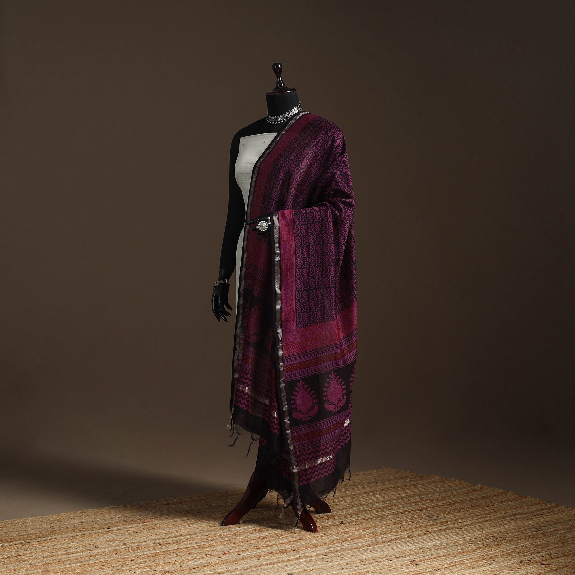 This purple bagh dupatta is hand block printed in Madhya Pradesh using natural dyes and traditional techniques. Made from a Chanderi silk and mercerised cotton blend, it features a zari border that adds a classic touch. Whether for a festive gathering or a casual outing, this piece brings effortless grace to your look.