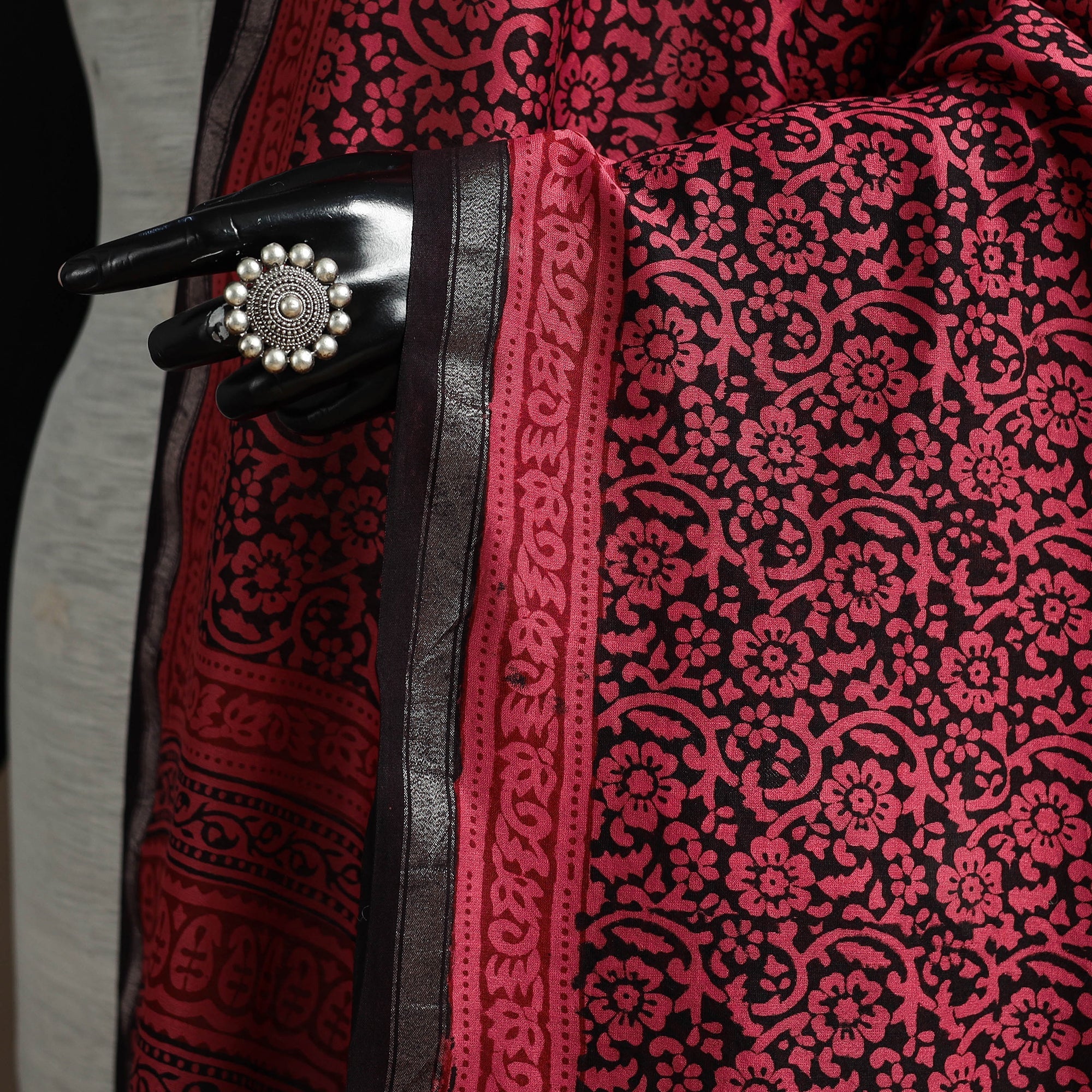 This pink bagh dupatta is hand block printed in Madhya Pradesh using natural dyes and traditional techniques. Made from a Chanderi silk and mercerised cotton blend, it features a zari border that adds a classic touch. Whether for a festive gathering or a casual outing, this piece brings effortless grace to your look.