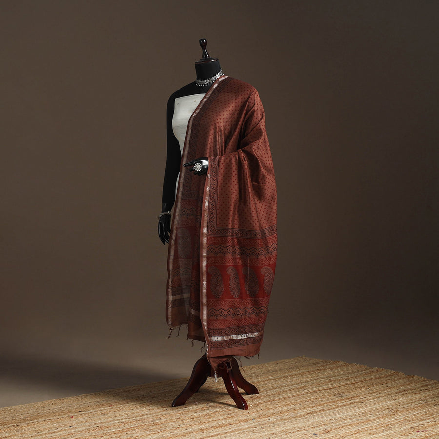 Brown - Chanderi Silk Bagh Block Print Natural Dyed Dupatta with Zari Border 33