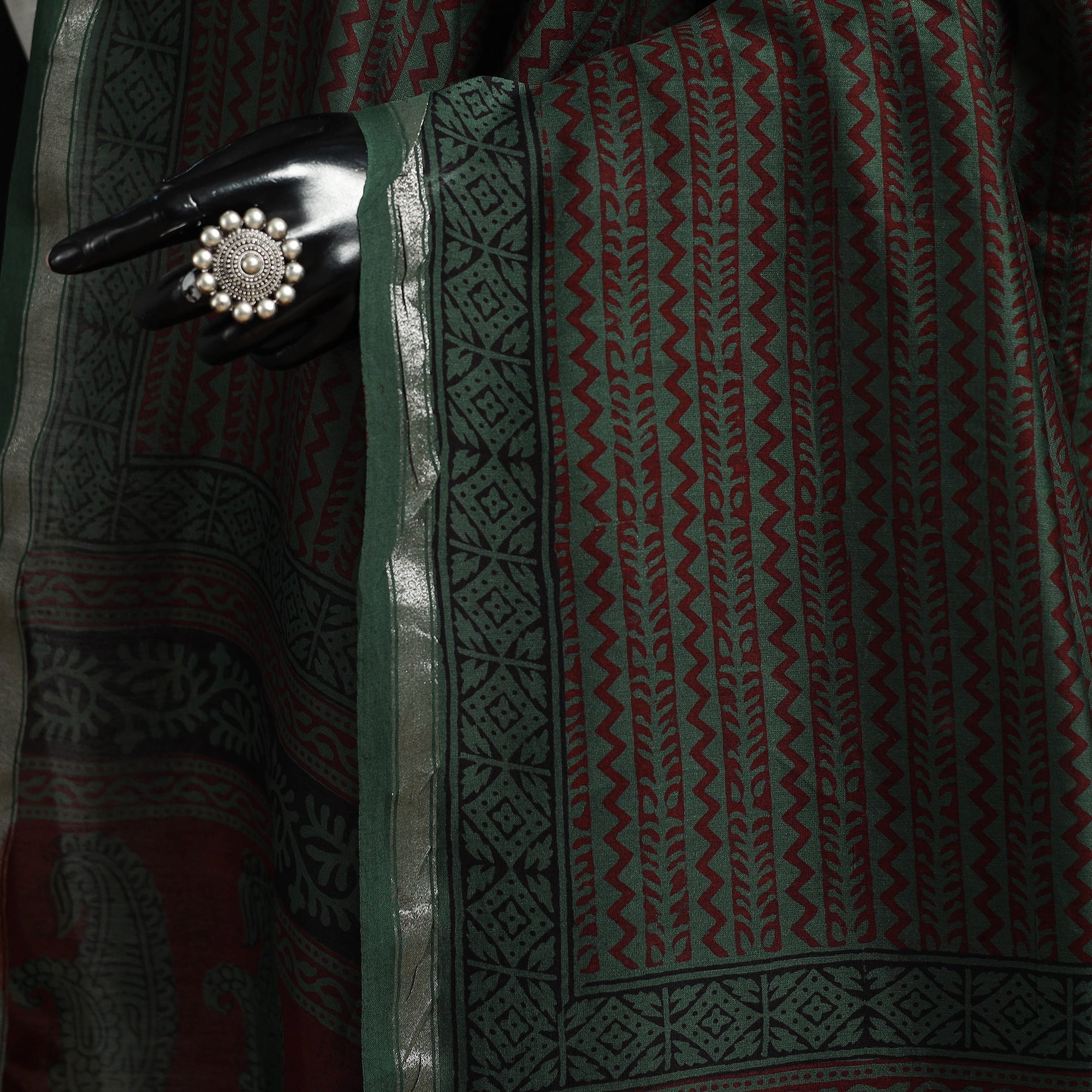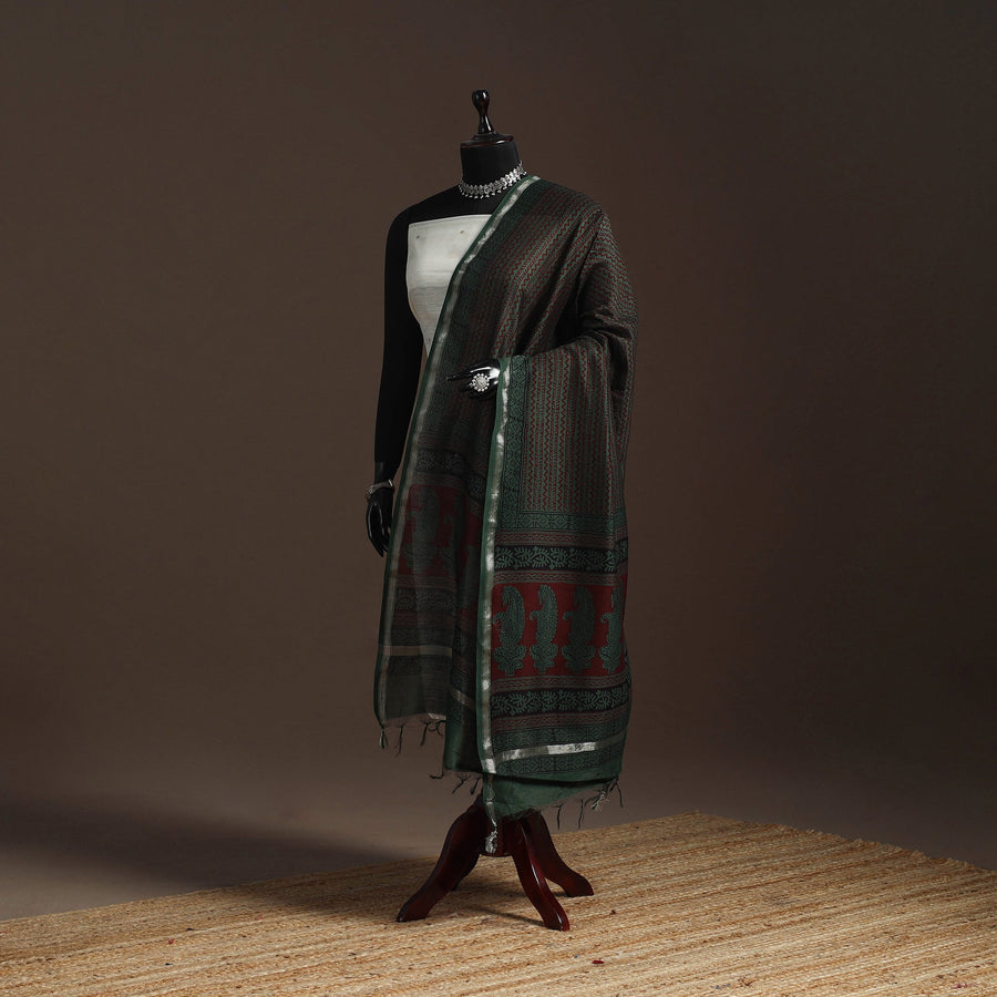 This green bagh dupatta is hand block printed in Madhya Pradesh using natural dyes and traditional techniques. Made from a Chanderi silk and mercerised cotton blend, it features a zari border that adds a classic touch. Whether for a festive gathering or a casual outing, this piece brings effortless grace to your look.