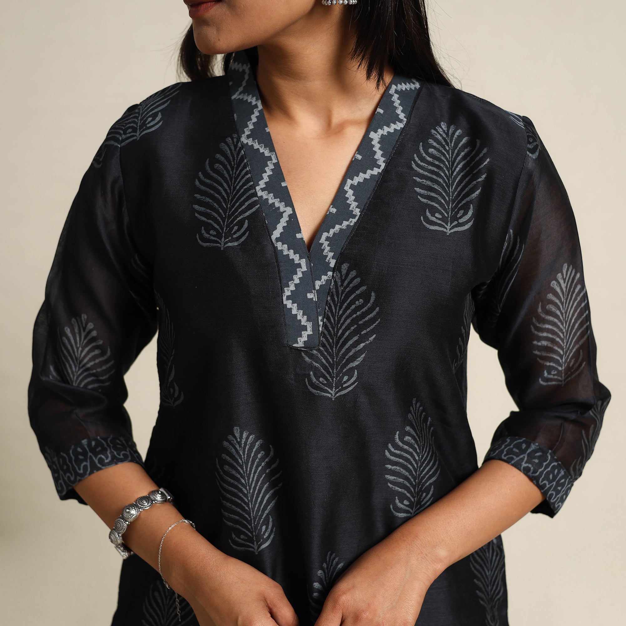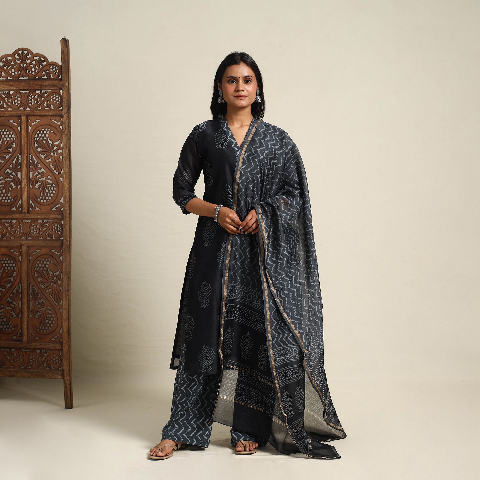 Step into timeless elegance with this authentic black chanderi silk cotton bagru prints kurta set. Featuring a soft chanderi kurta with a handy side pocket, a breezy cotton palazzo with pockets, and a graceful dupatta, this set blends ethnic charm with everyday ease. Ideal for festive gatherings or casual day-outs, it perfectly captures the essence of tradition with a touch of modern comfort.