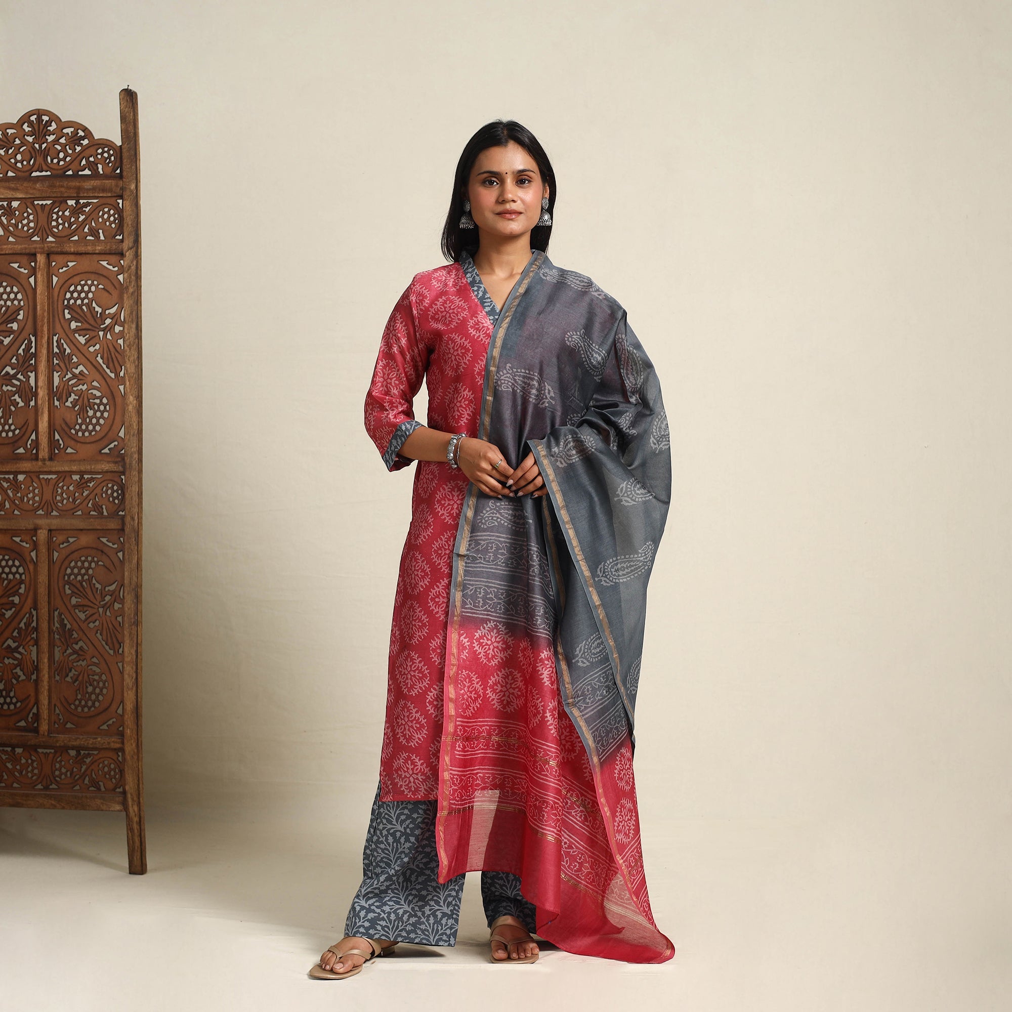 Step into timeless elegance with this authentic dark pink chanderi silk cotton bagru prints kurta set. Featuring a soft chanderi kurta with a handy side pocket, a breezy cotton palazzo with pockets, and a graceful dupatta, this set blends ethnic charm with everyday ease. Ideal for festive gatherings or casual day-outs, it perfectly captures the essence of tradition with a touch of modern comfort.