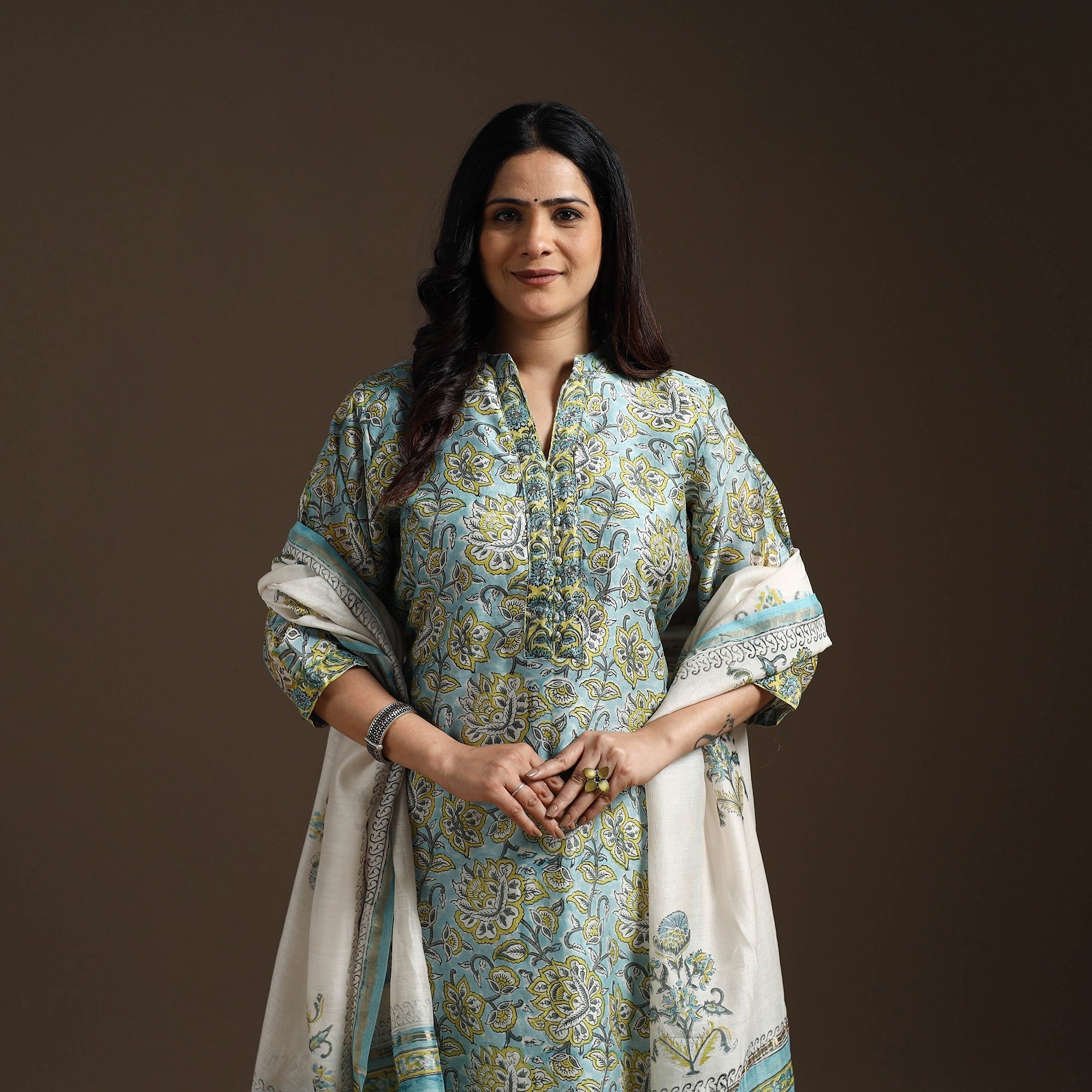 | Material | Blue chanderi silk cotton suit set features traditional sanganeri block printing from Rajasthan known for its fine floral patterns. Made using hand carved wooden blocks. Includes straight kurta with side pocket cotton palazzo with elastic waist and pockets and a matching dupatta. Perfect for both daily wear and special moments, it beautifully combines comfort and charm. |