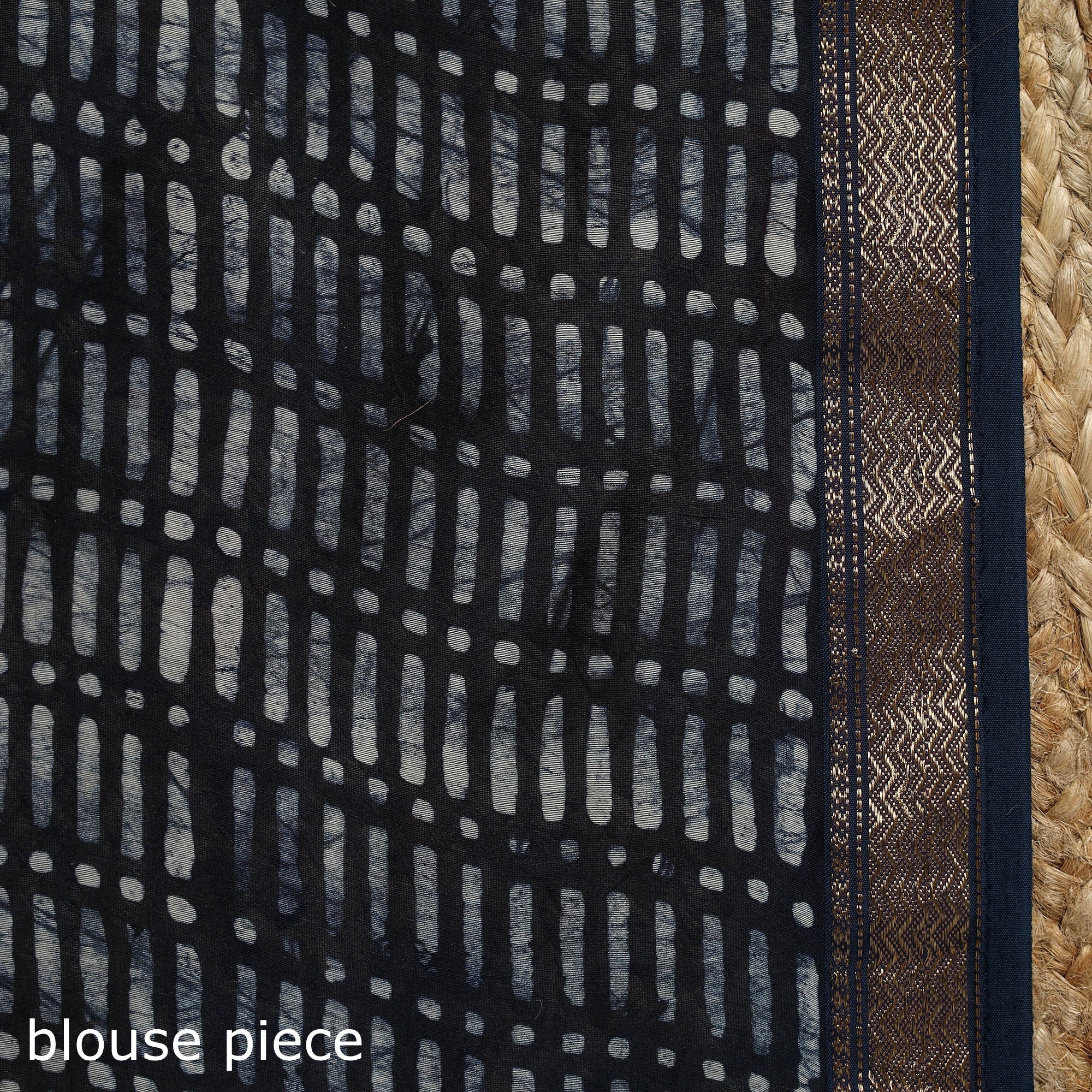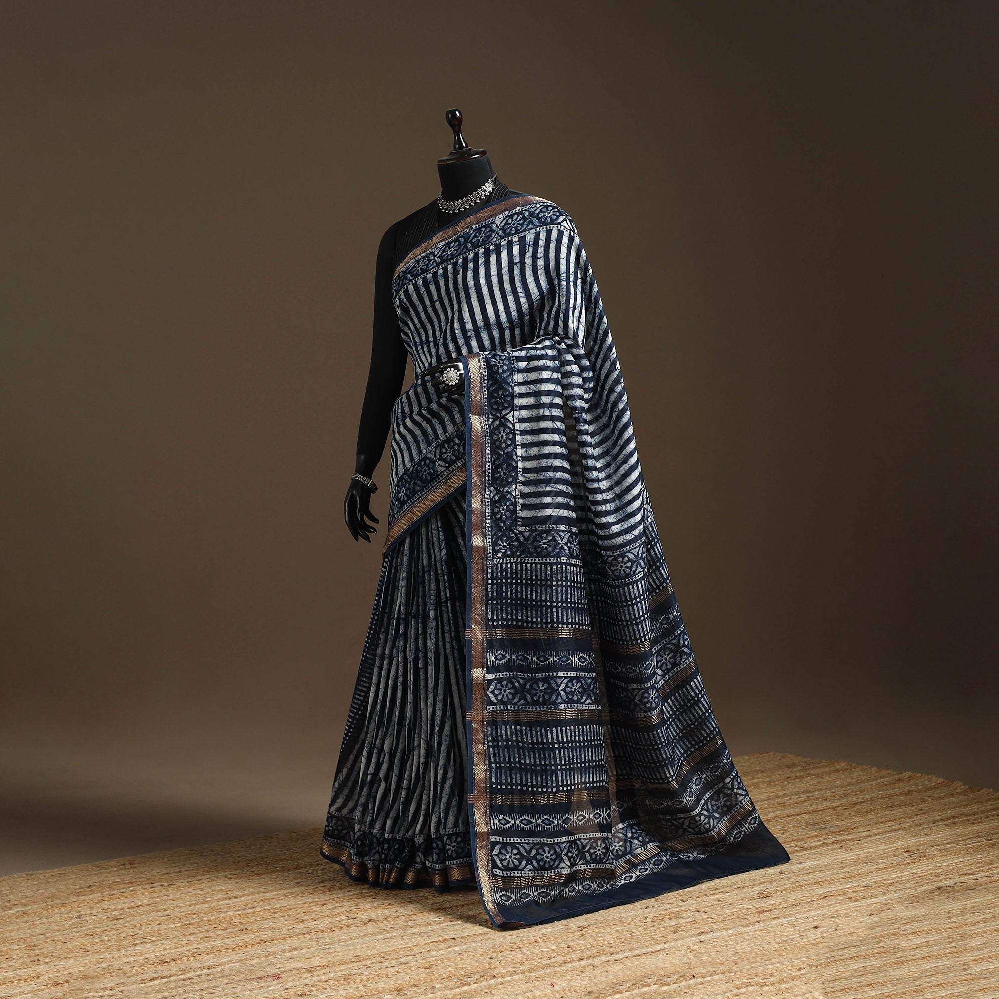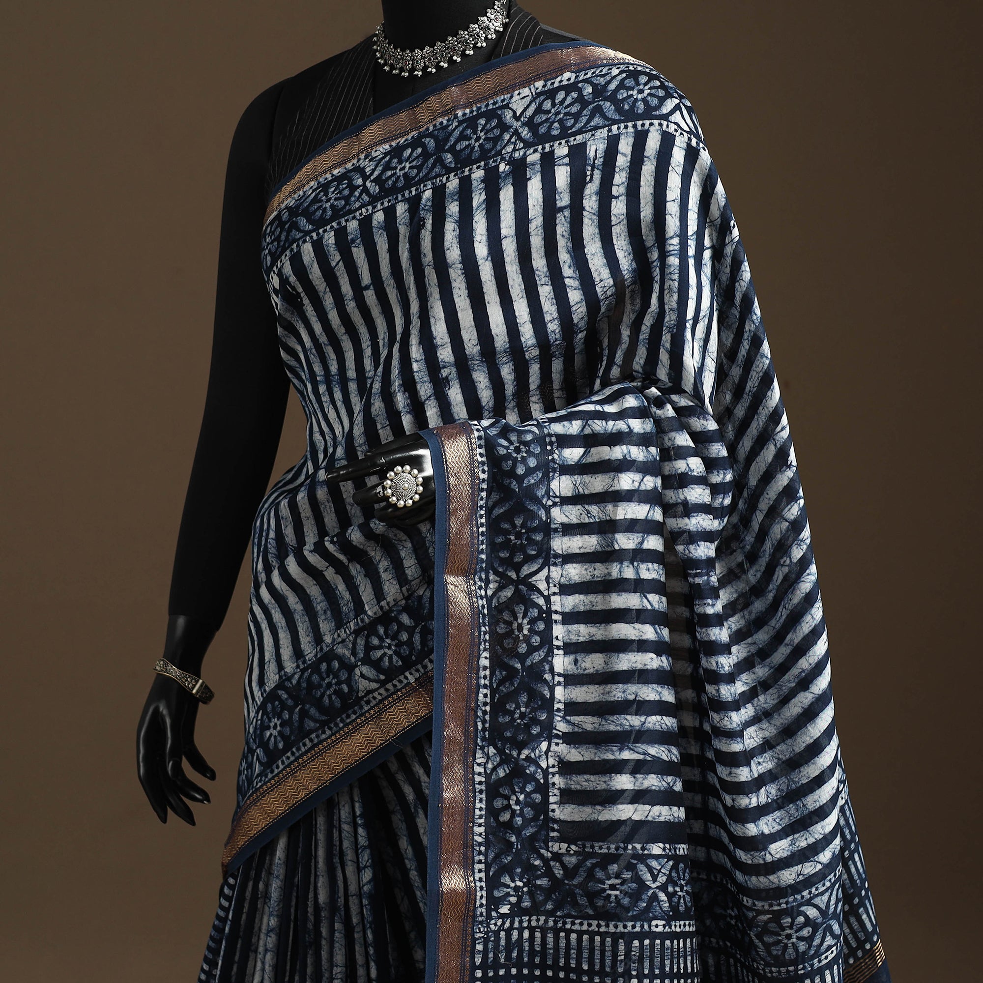 Blue chanderi silk cotton batik print saree by Md. Shariff showcases the traditional wax-resist dyeing technique, where fine cracks in the wax create naturally unique patterns. The blend of cotton and chanderi fabric keeps it light and comfortable for long hours, making it suitable for everyday wear, small gatherings and meaningful cultural occasions.