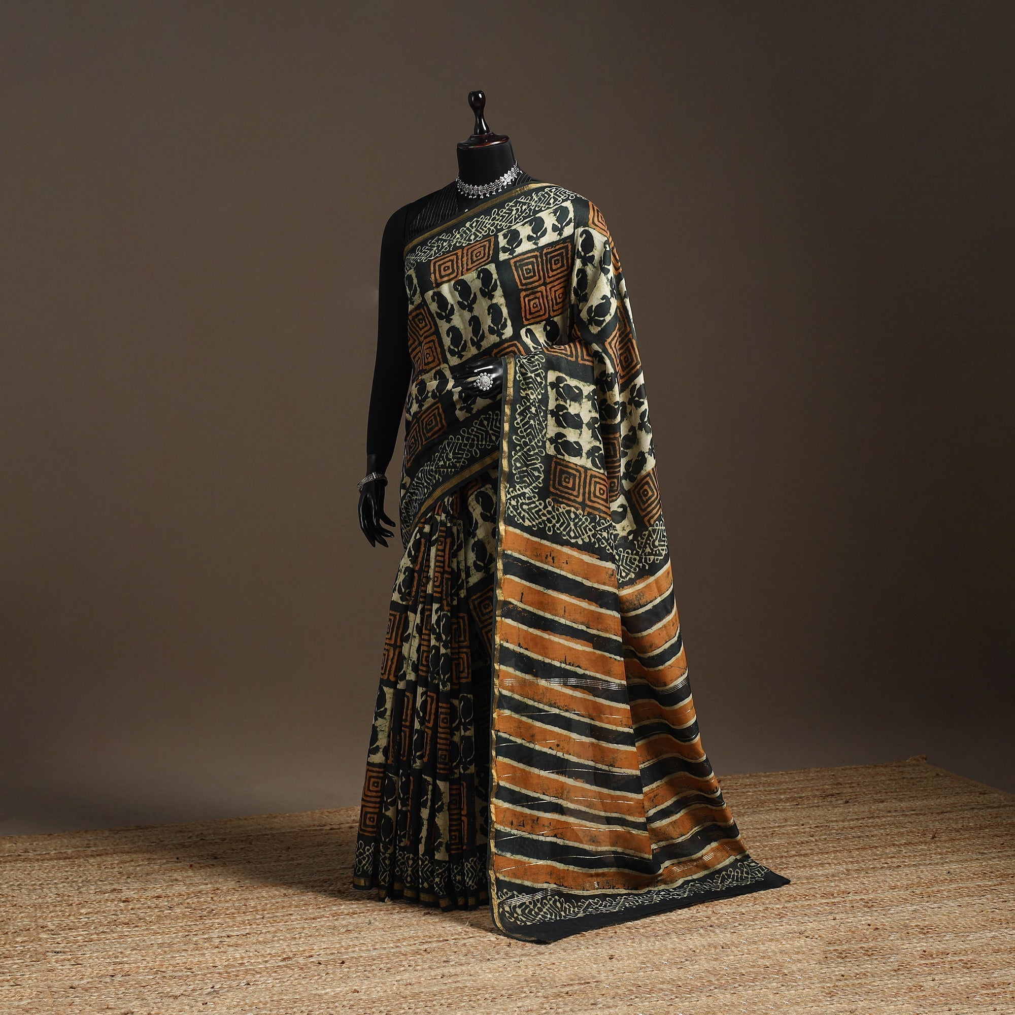 | Material | This multicolor chanderi silk-cotton saree with zari border features traditional bagru block printing, known for its bold patterns. Made using hand-carved wooden blocks and natural dyes, it has a light, crisp texture and a graceful drape. Originating from Bagru, a village near Jaipur in Rajasthan, this printing style has been practiced for generations. Suitable for both everyday wear and special occasions, it beautifully blends comfort and style. A Note on Handmade Beauty: |