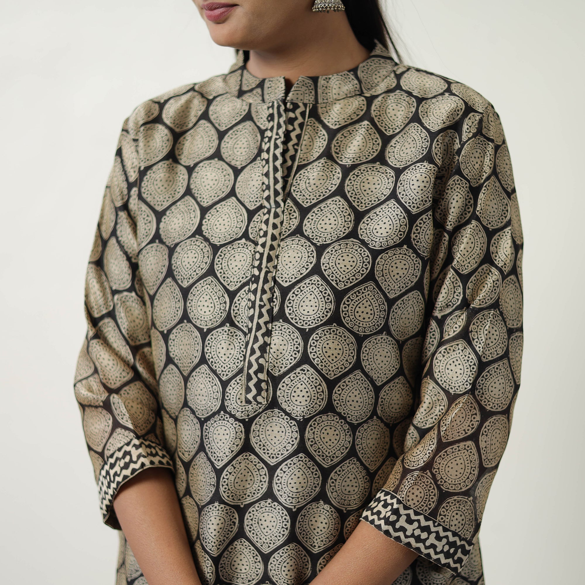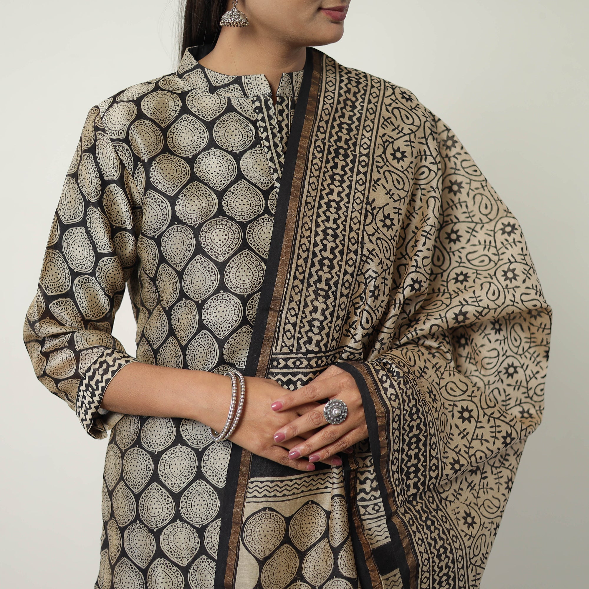 Traditional beige chanderi silk cotton hand block bagru print kurta set. This ensemble features a handcrafted Chanderi silk kurta adorned with Bagru motifs, a comfortable cotton palazzo with pockets, and a zari-bordered dupatta. Each piece tells the story of skilled artisans from Rajasthan who have preserved this eco-friendly printing technique for generations. Perfect for festivals or everyday elegance.