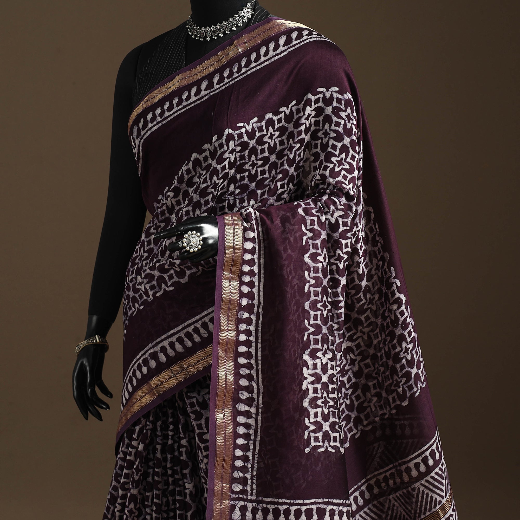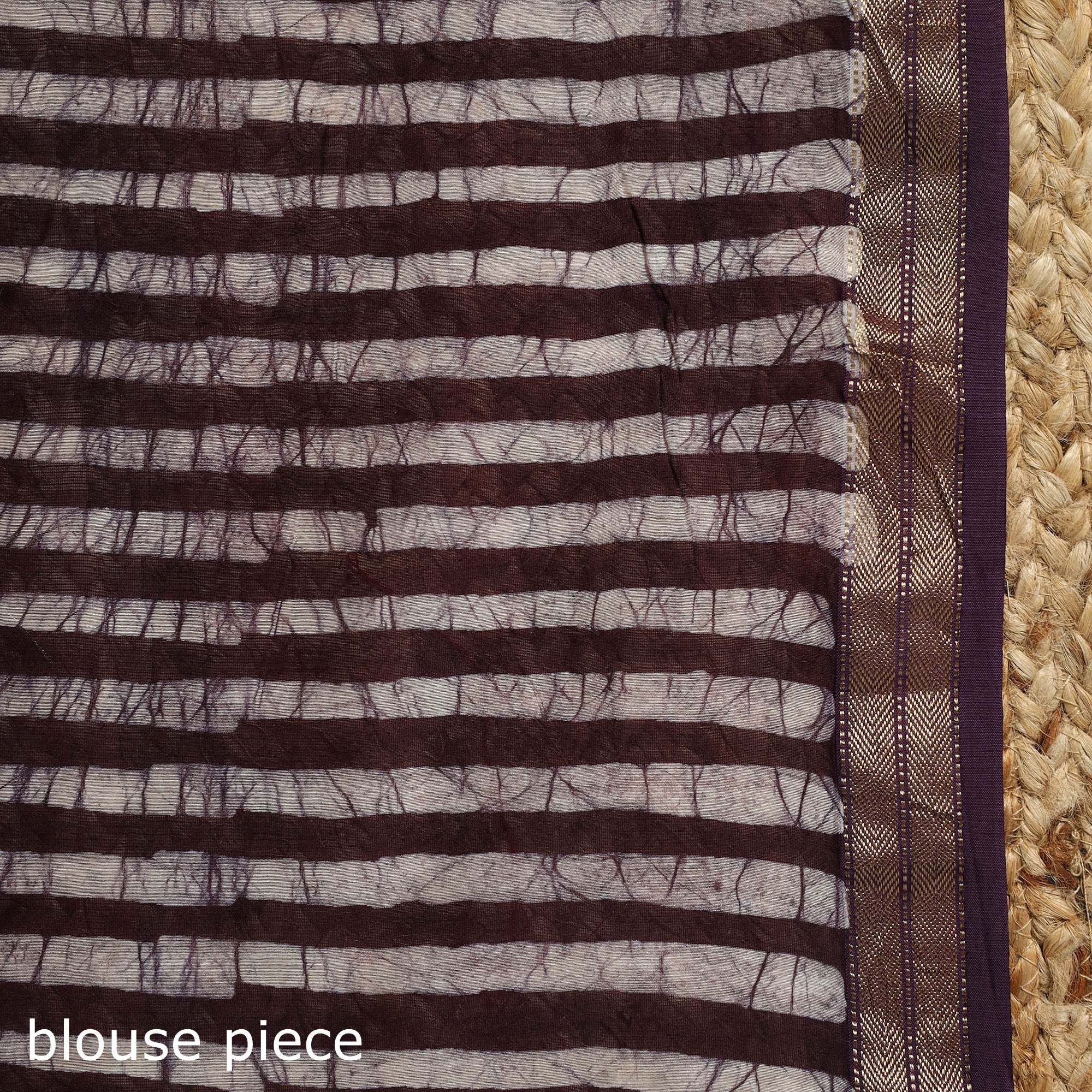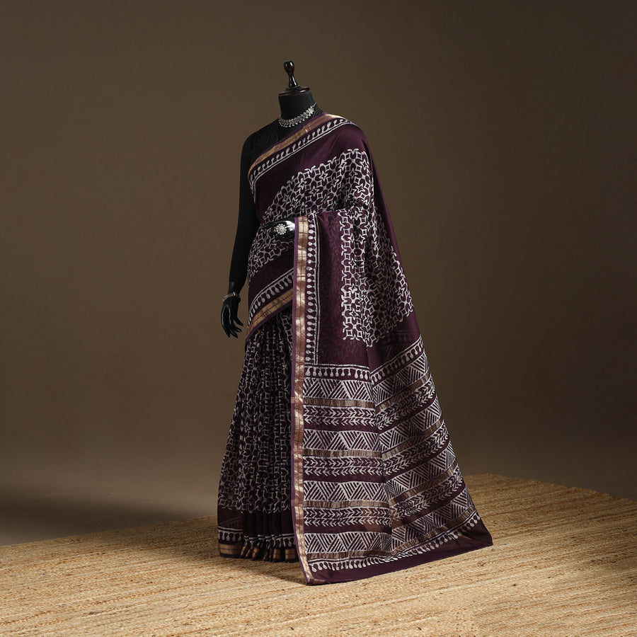 Purple chanderi silk cotton batik print saree by Md. Shariff showcases the traditional wax-resist dyeing technique, where fine cracks in the wax create naturally unique patterns. The blend of cotton and chanderi fabric keeps it light and comfortable for long hours, making it suitable for everyday wear, small gatherings and meaningful cultural occasions.