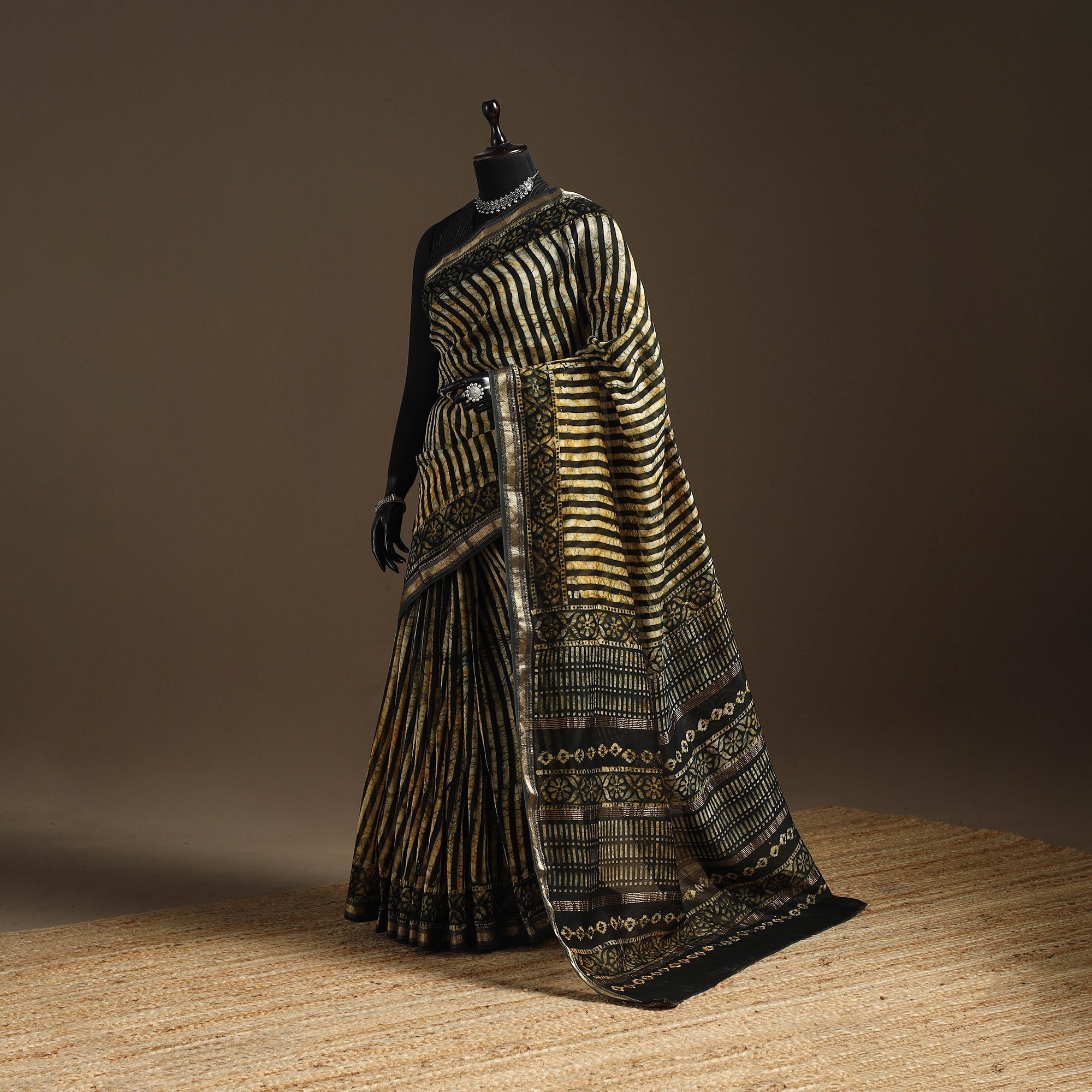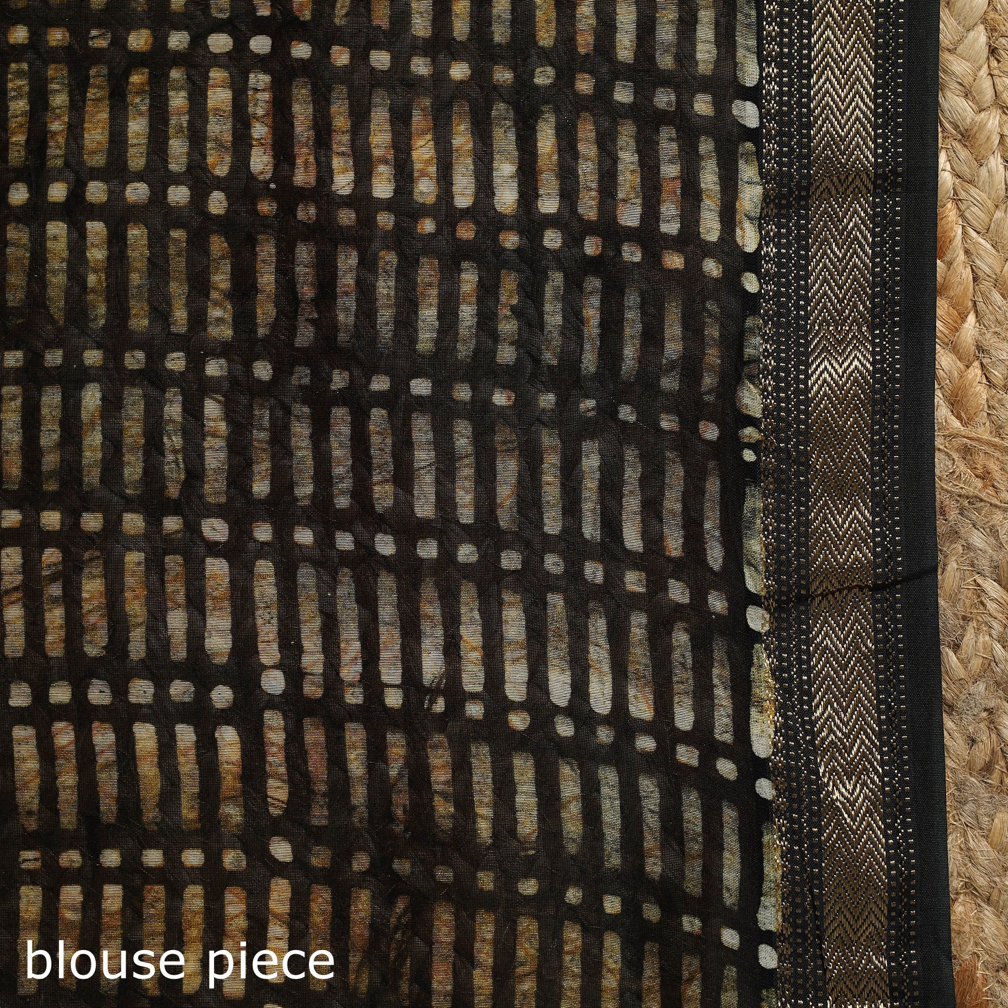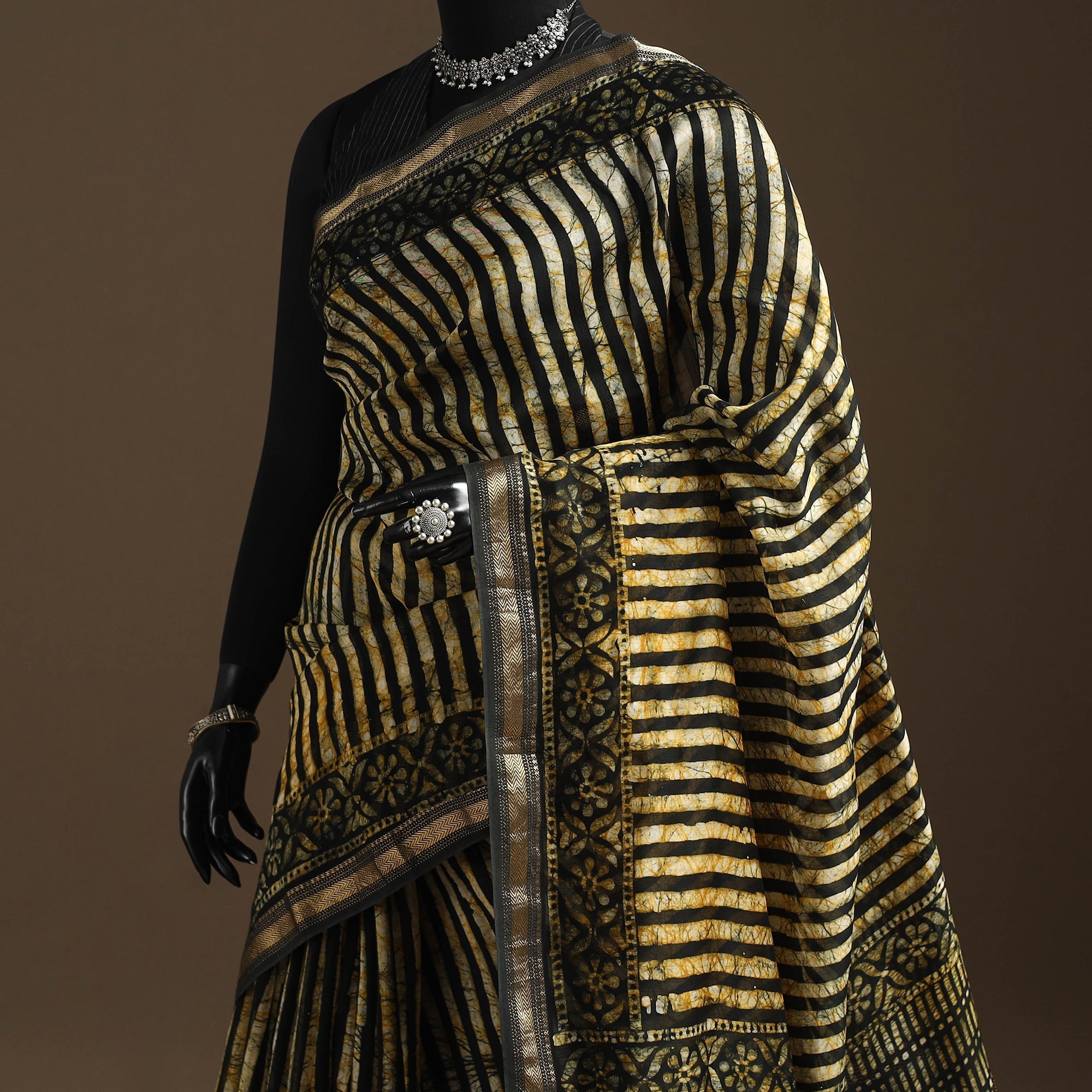 Green chanderi silk cotton batik print saree by Md. Shariff showcases the traditional wax-resist dyeing technique, where fine cracks in the wax create naturally unique patterns. The blend of cotton and chanderi fabric keeps it light and comfortable for long hours, making it suitable for everyday wear, small gatherings and meaningful cultural occasions.