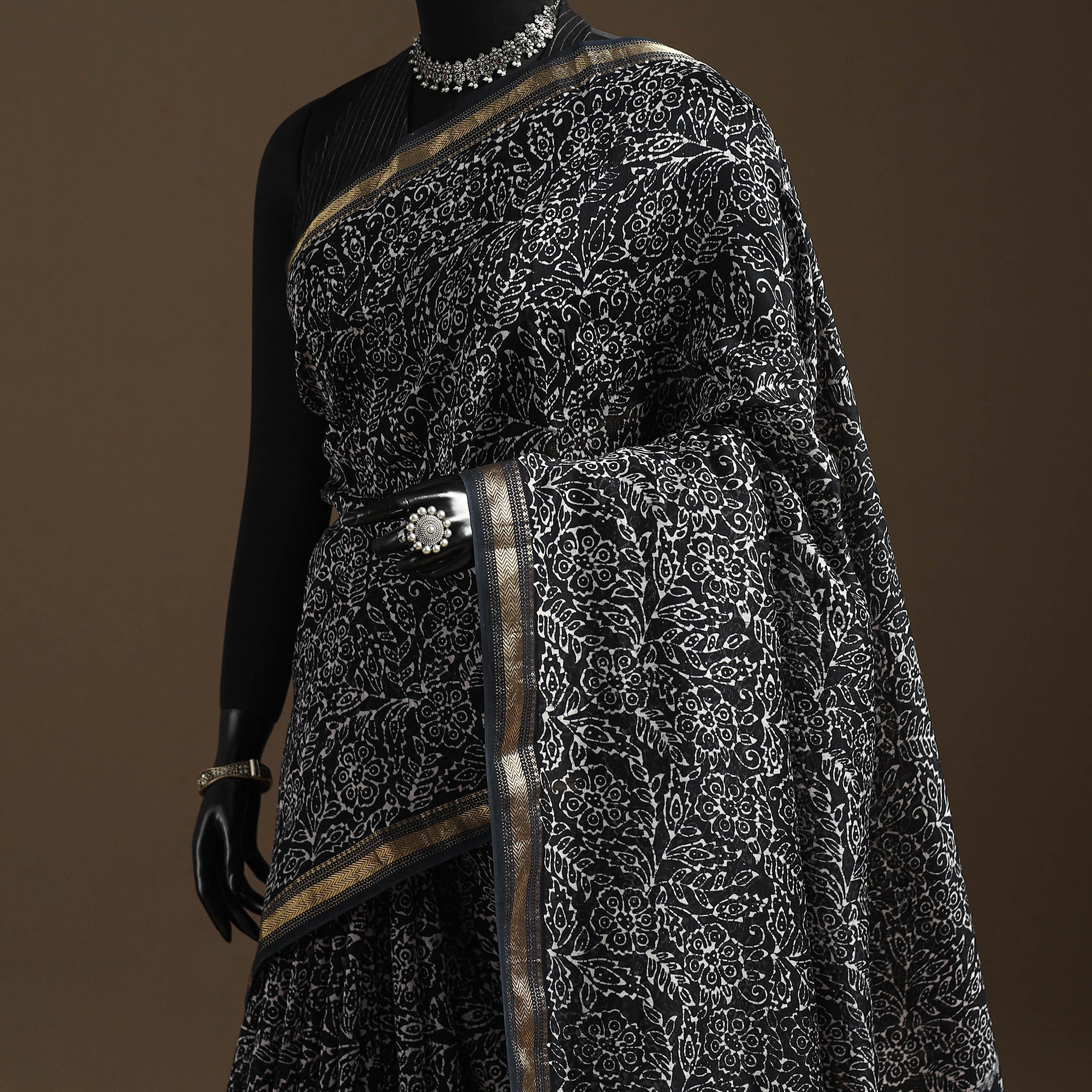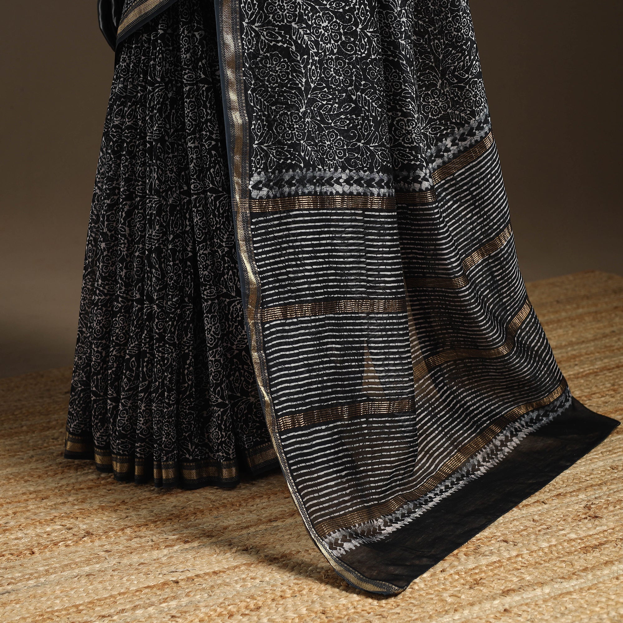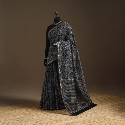 Black chanderi silk cotton batik print saree by Md. Shariff showcases the traditional wax-resist dyeing technique, where fine cracks in the wax create naturally unique patterns. The blend of cotton and chanderi fabric keeps it light and comfortable for long hours, making it suitable for everyday wear, small gatherings and meaningful cultural occasions.