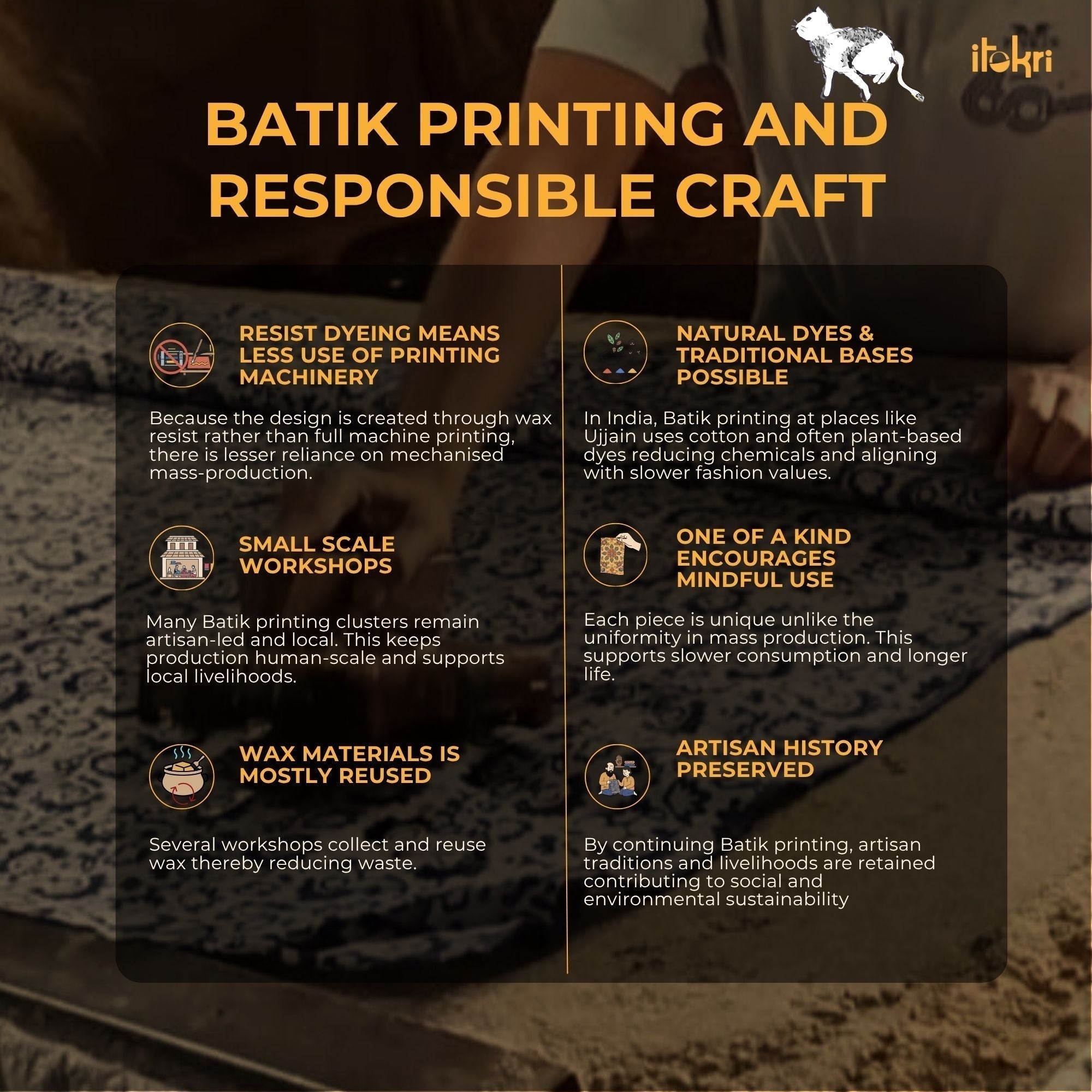 Batik is a very famous technique of wax-resist dyeing applied to whole cloth. The traditional designs and motifs in Indian batik are exceptional. It is a type of resist printing process wherein wax is applied to the fabric in specific areas.