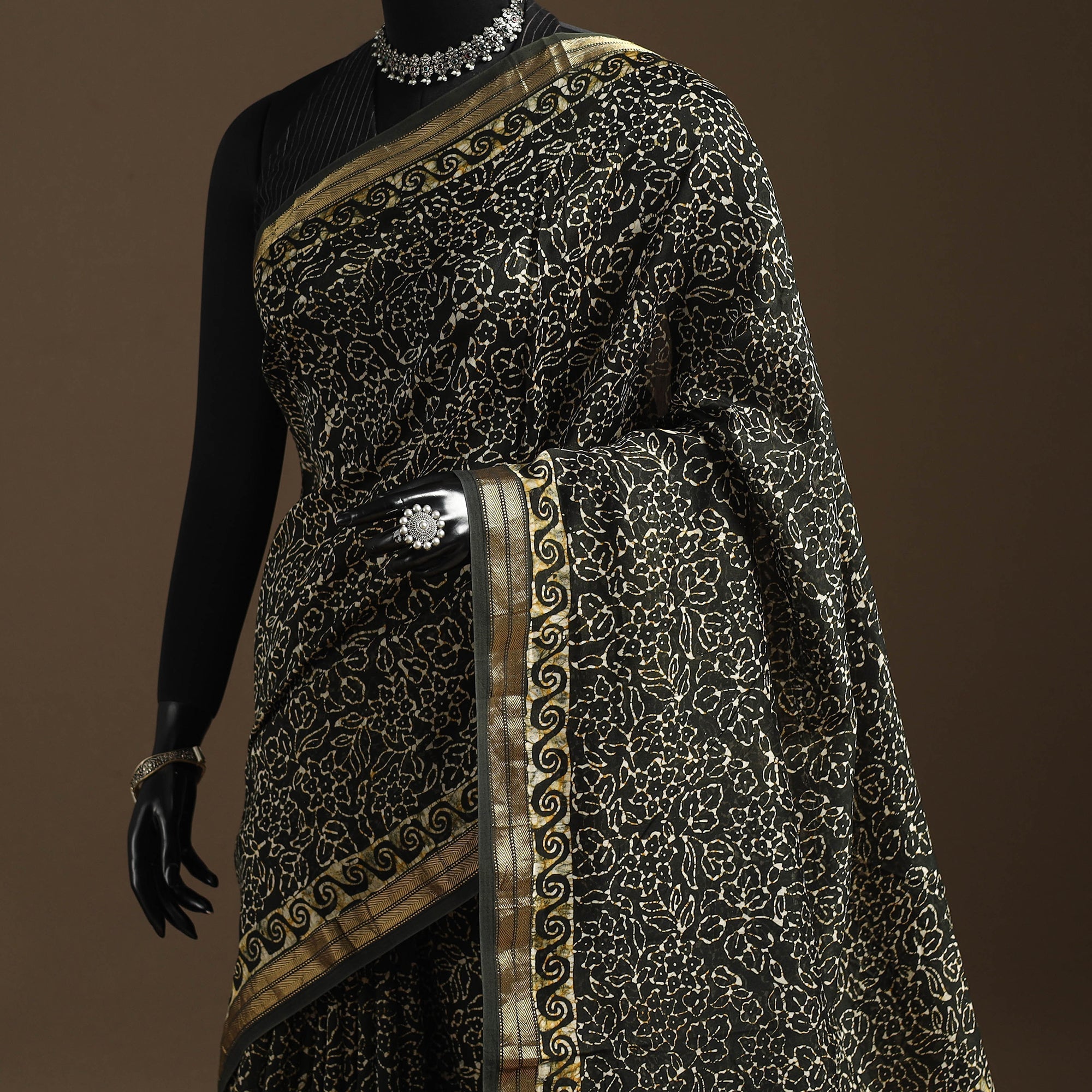 Black chanderi silk cotton batik print saree by Md. Shariff showcases the traditional wax-resist dyeing technique, where fine cracks in the wax create naturally unique patterns. The blend of cotton and chanderi fabric keeps it light and comfortable for long hours, making it suitable for everyday wear, small gatherings and meaningful cultural occasions.