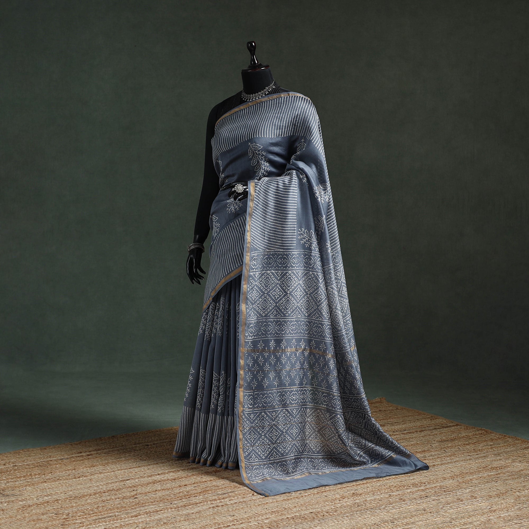 | Material | Grey hand block batik print saree. Made from chanderi silk cotton, this saree is created using the traditional wax-resist dyeing technique, a craft believed to be over 2,000 years old. The motifs beautifully reflect regional artistry passed down through generations. The breathable saree makes it suitable for office wear, cultural events, daytime functions, casual outings and gatherings. |