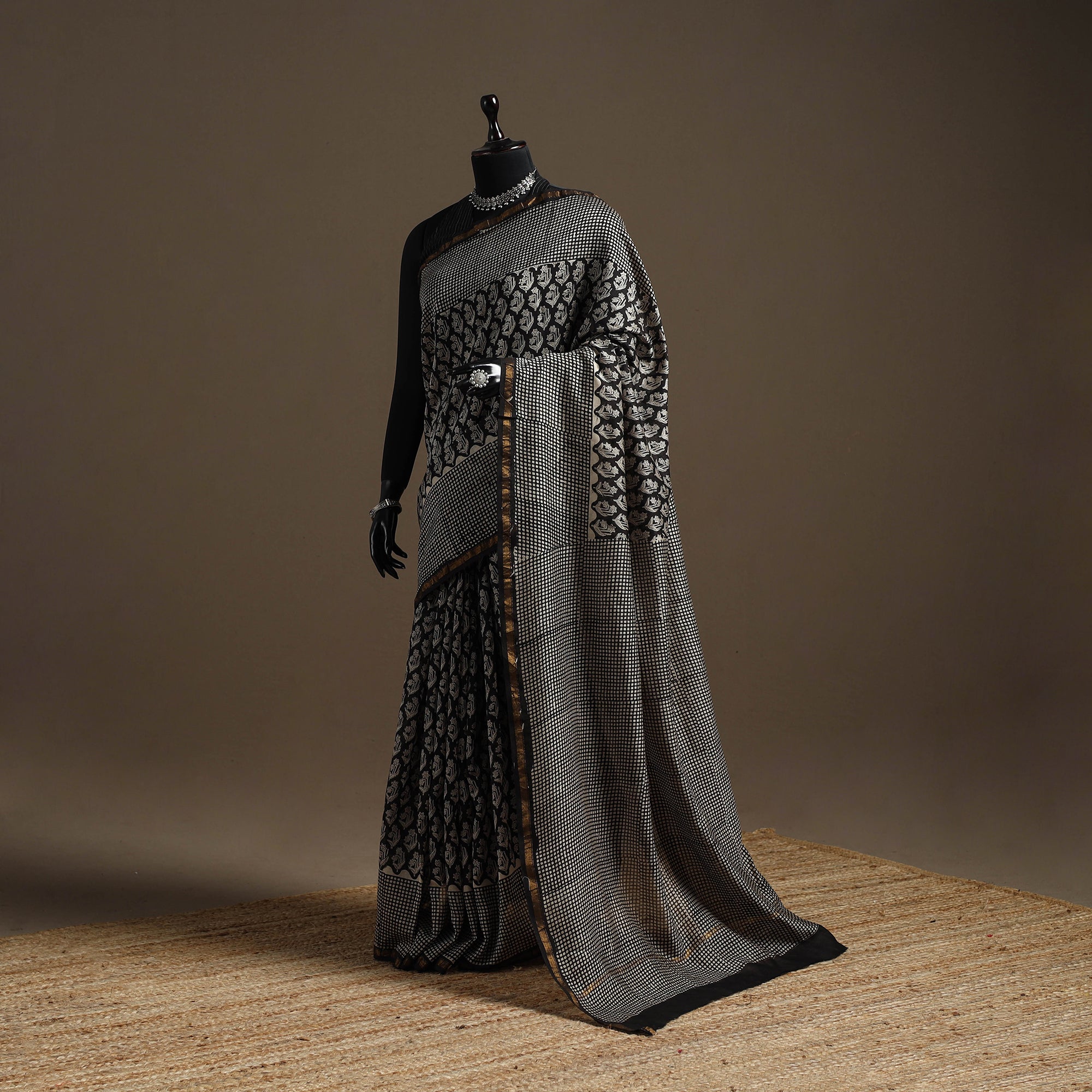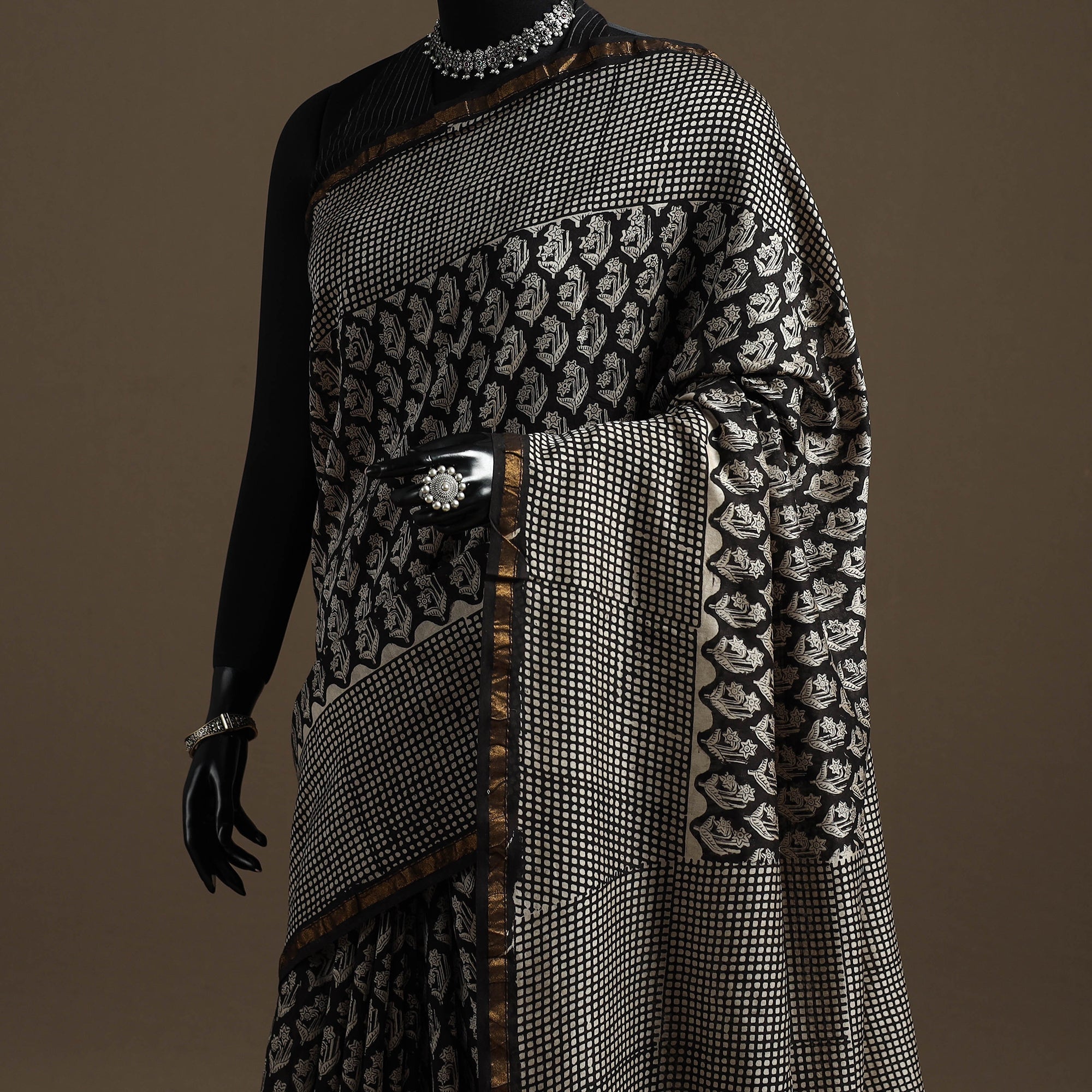 Black chanderi silk cotton saree with zari border features traditional bagru block printing, known for its bold patterns. Made using hand-carved wooden blocks and natural dyes, it has a light, crisp texture and a graceful drape. Originating from Bagru, a village near Jaipur in Rajasthan, this printing style has been practiced for generations. Suitable for both everyday wear and special occasions, it beautifully blends comfort and style.
